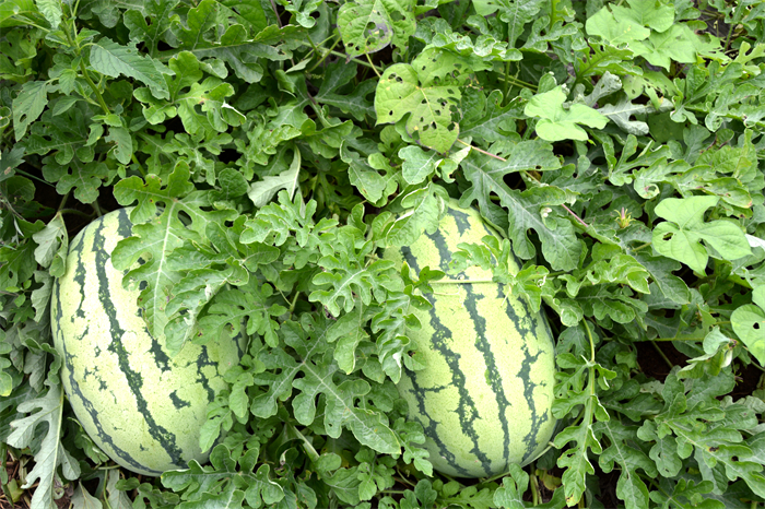 一排排西瓜整齐排列,一个个西瓜掩映在藤蔓之间,圆润饱满,向社会爱心人士传递着丰收的喜悦。