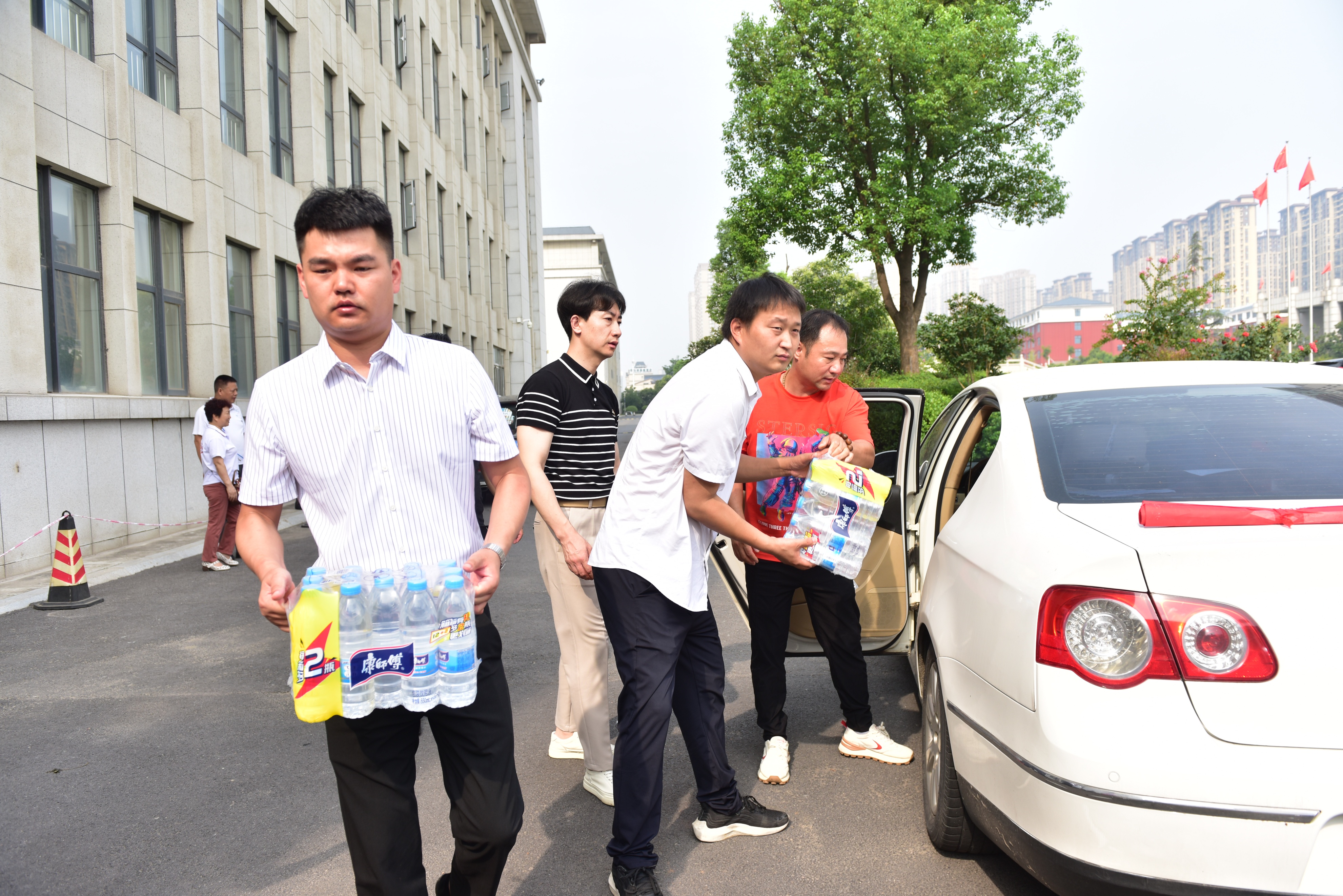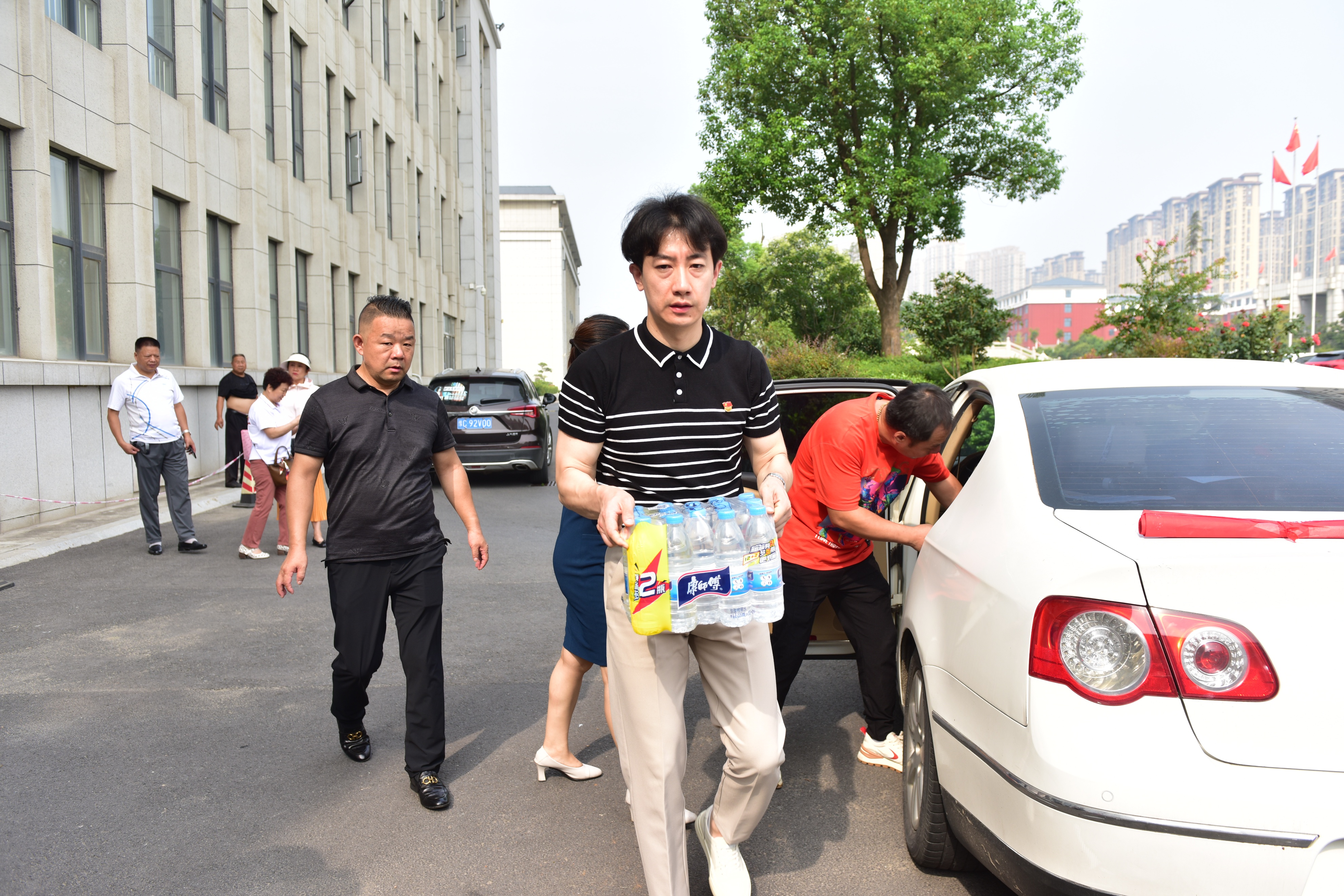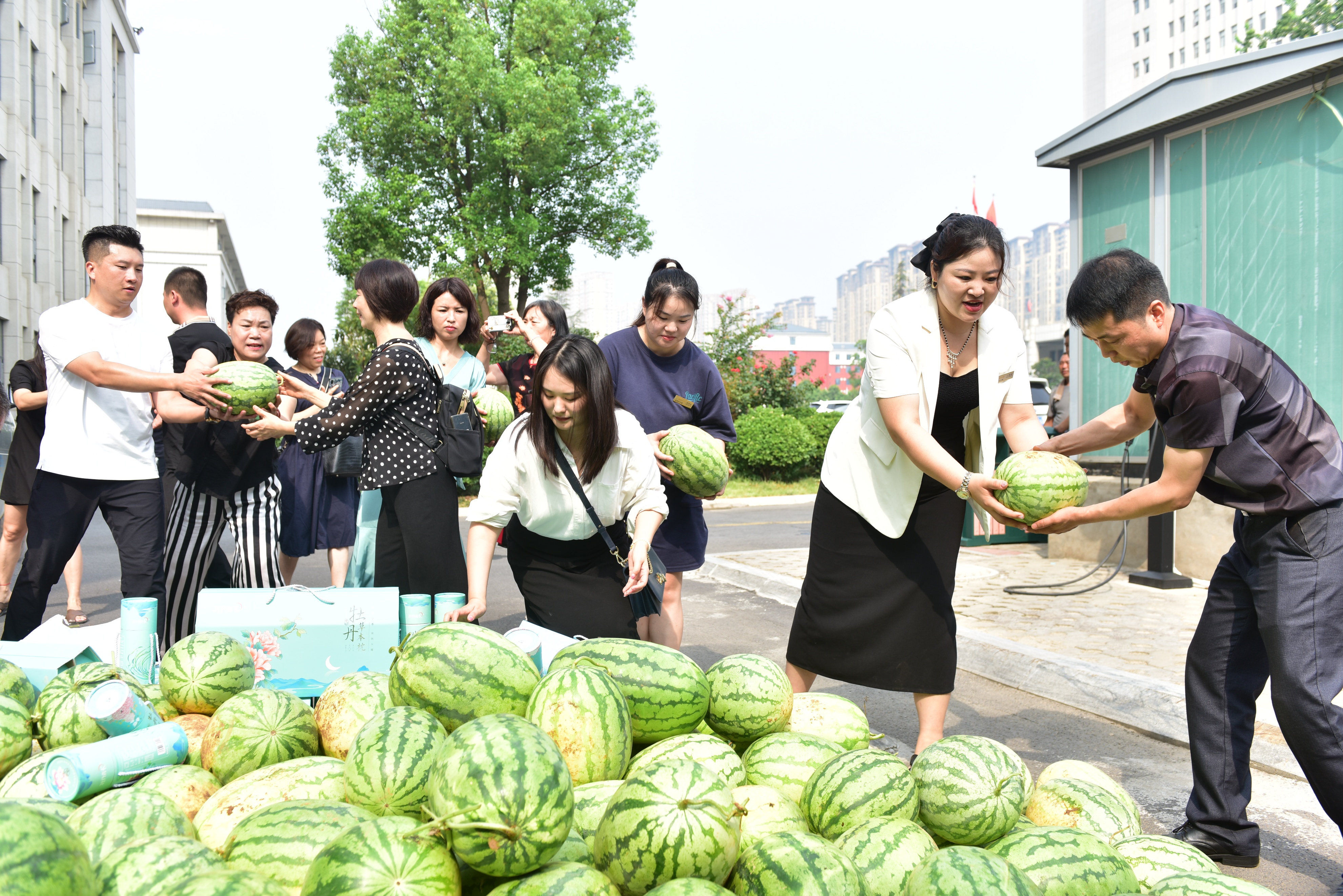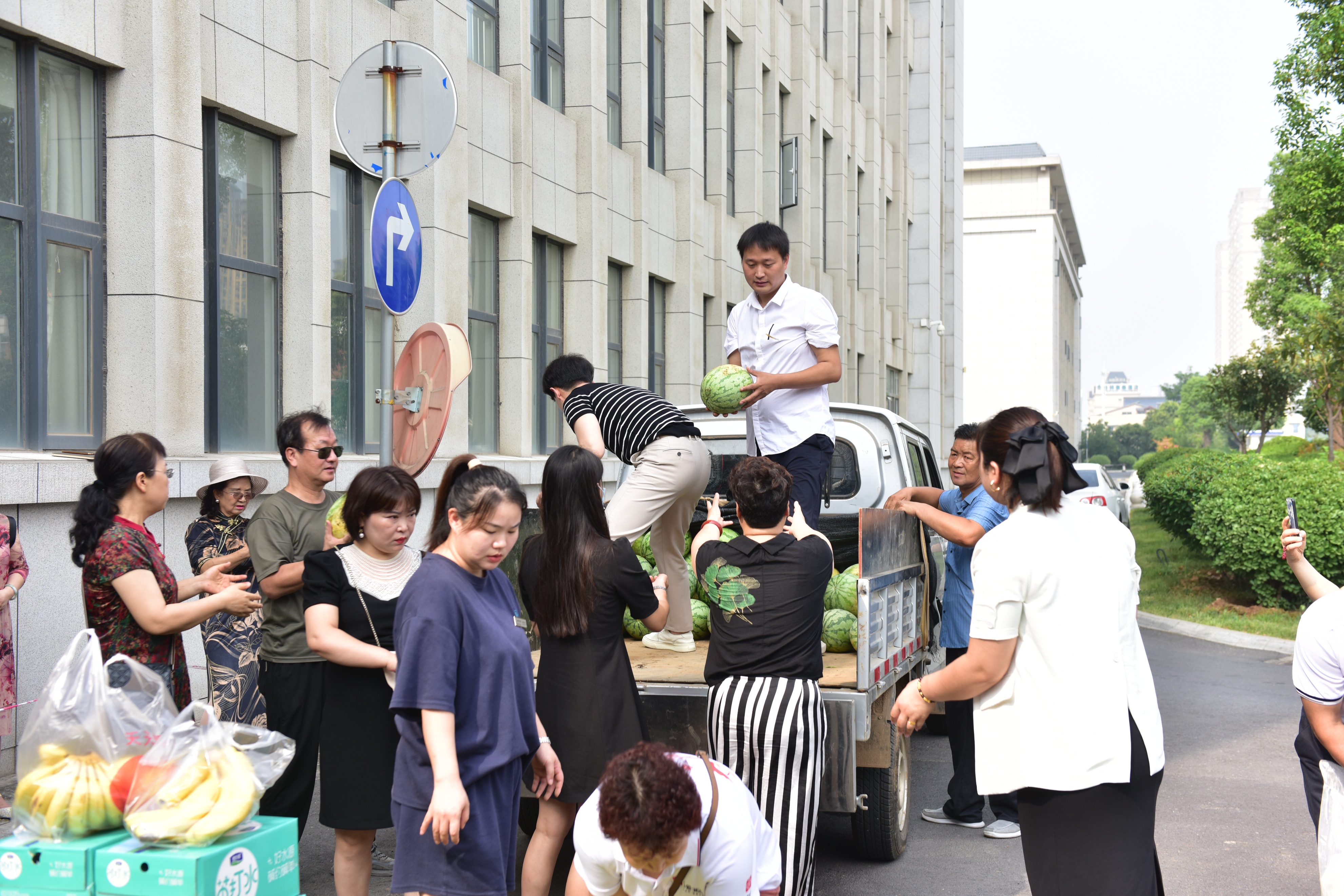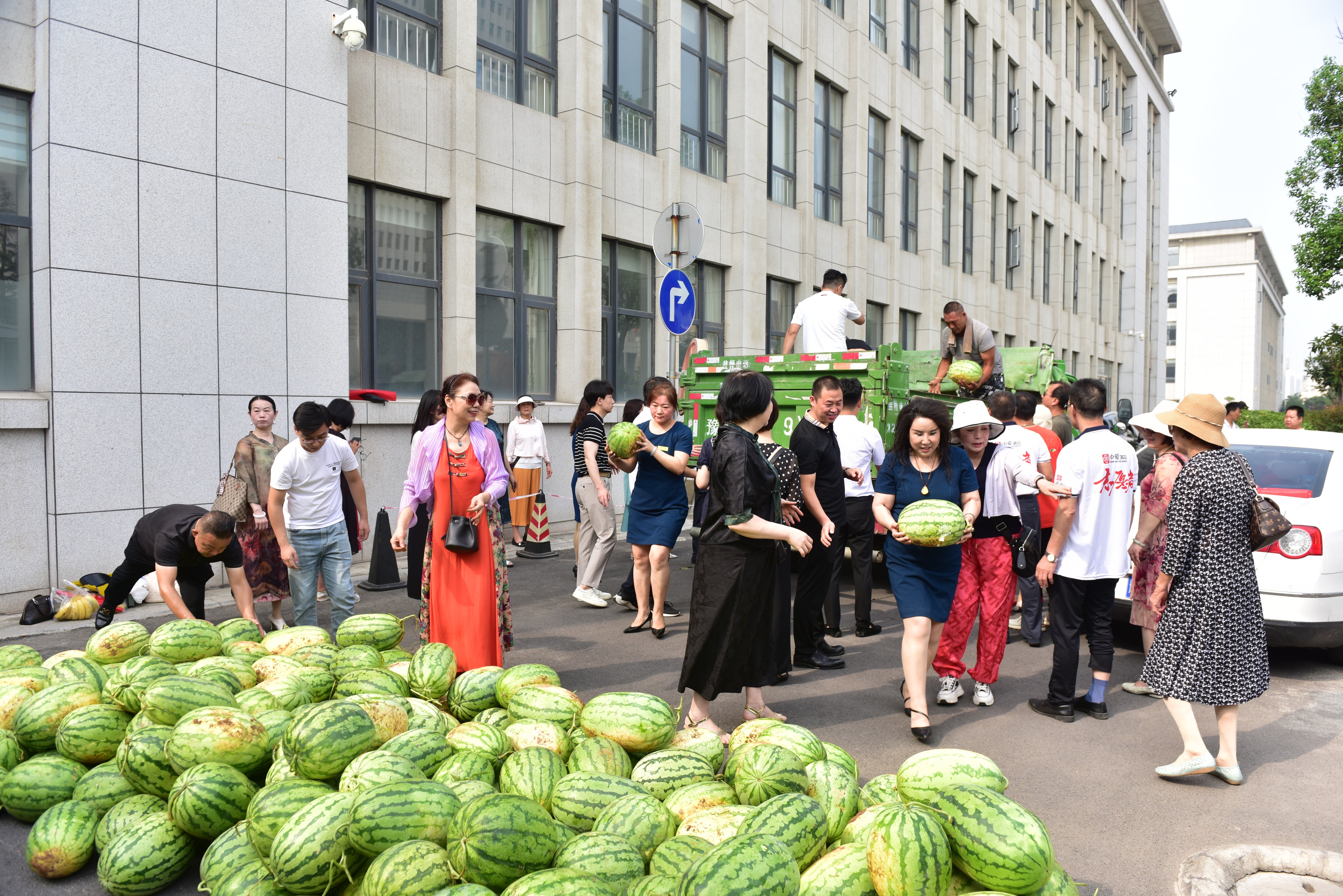 一辆满载着大家的爱心的新鲜大西瓜和纯净水,葡萄、大米面、牡丹锤、牡丹枕等的车辆驶入洛阳市老城区环卫局,爱心人士将车上的慰问物资卸下,送到每一位环卫工人手中。