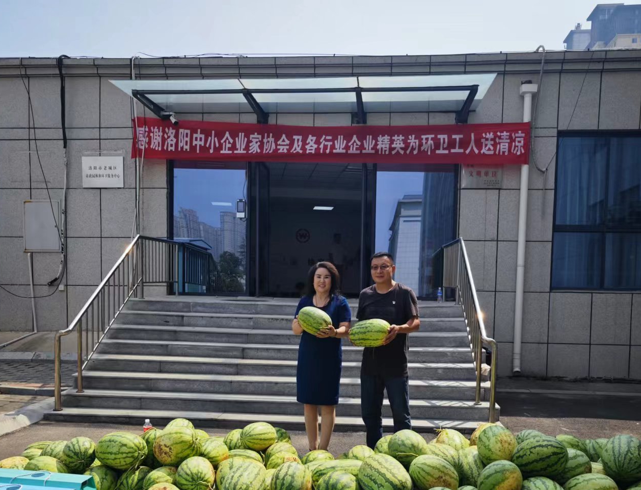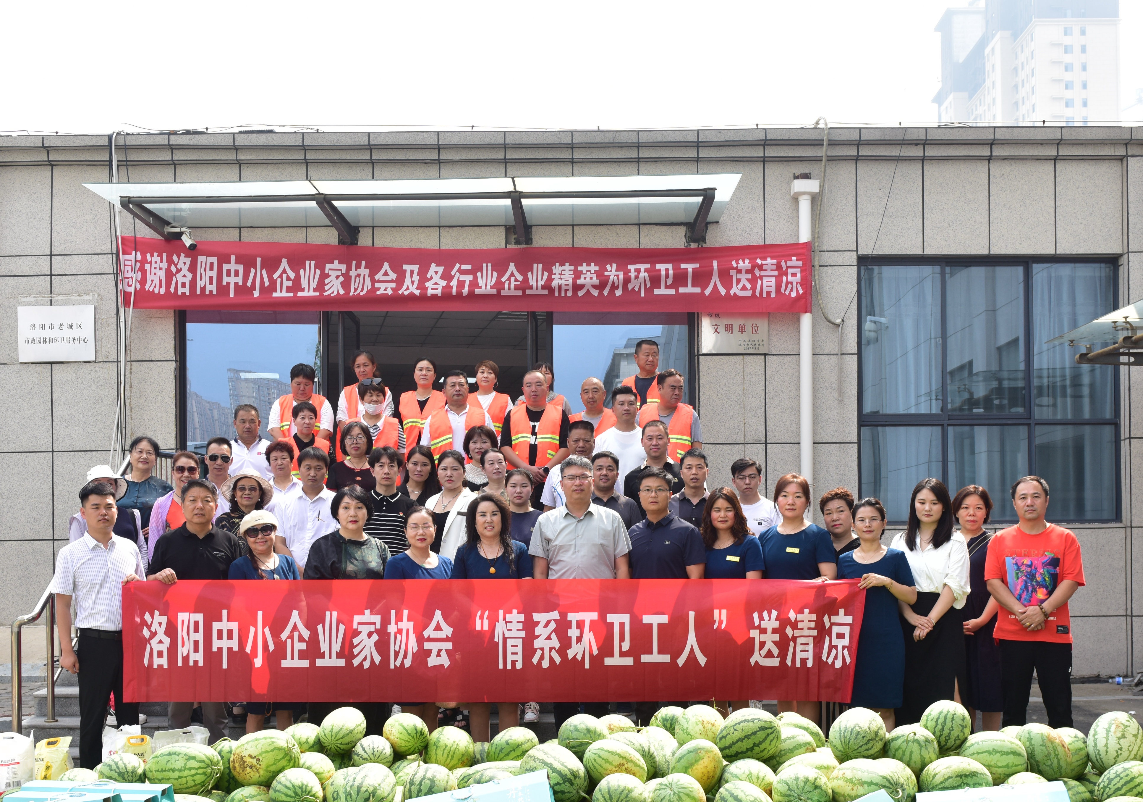 8月11日一大早,洛阳中小企业家协会会长张金苹带领洛阳中小企业家协会秘书长彭冬冬、副会长常晓龙、洛宁县小界乡南坡村党支部委员会、村民委员会、双桥村村党支部委员会、村民委员会、河南农购网洛阳运营中心、凤凰山生态纪念园、旗袍文化促进会、协会爱心企业家和社会爱心人士到老城区城市管理局共同看望慰问“环卫工人 送清凉献爱心”社会公益活动。