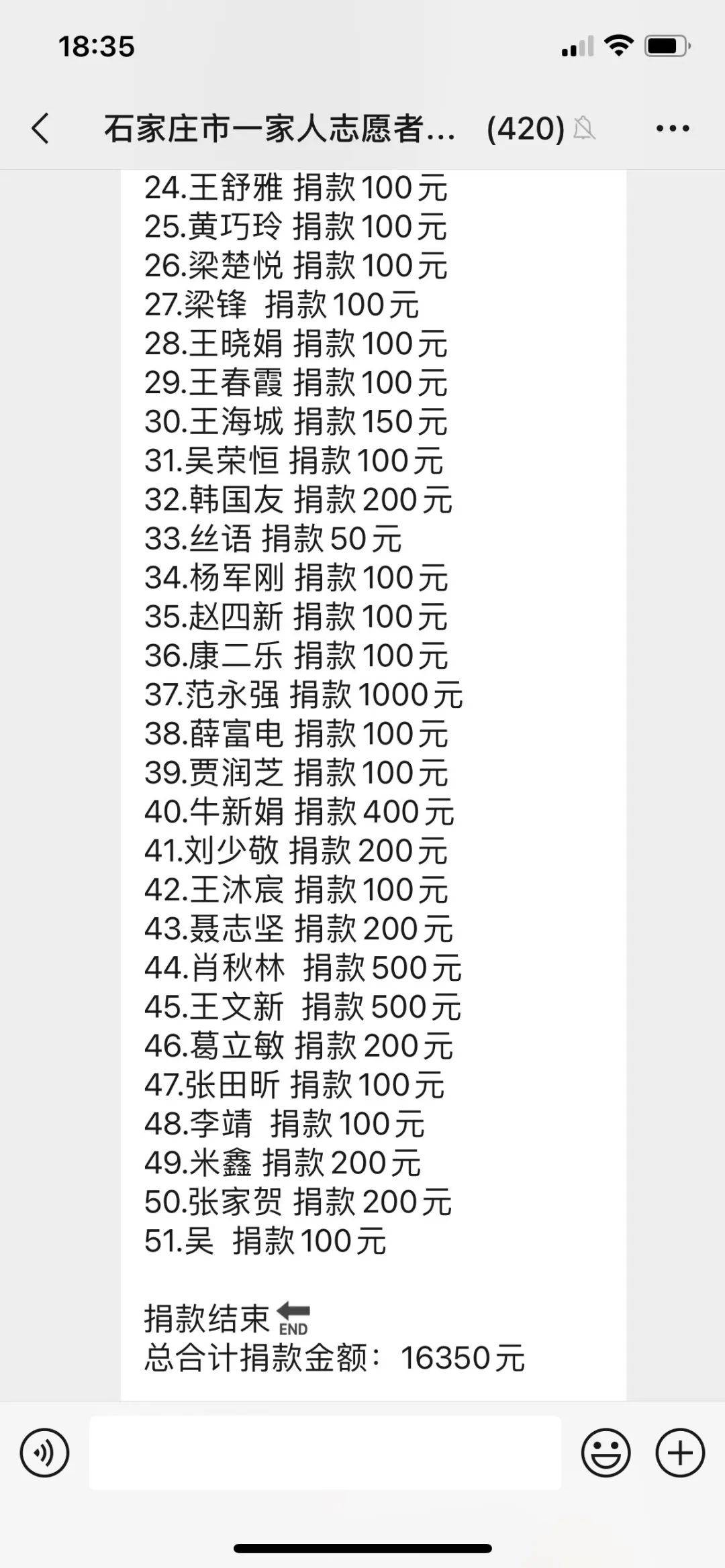 点滴之水,可成江河。一家人志愿者心往一块想,劲儿往一块使,2天多的时间里,就捐款16350元!随后,志愿者代表范永强、温德军、牛振河一起用这些善款购买了村民急需的物资。