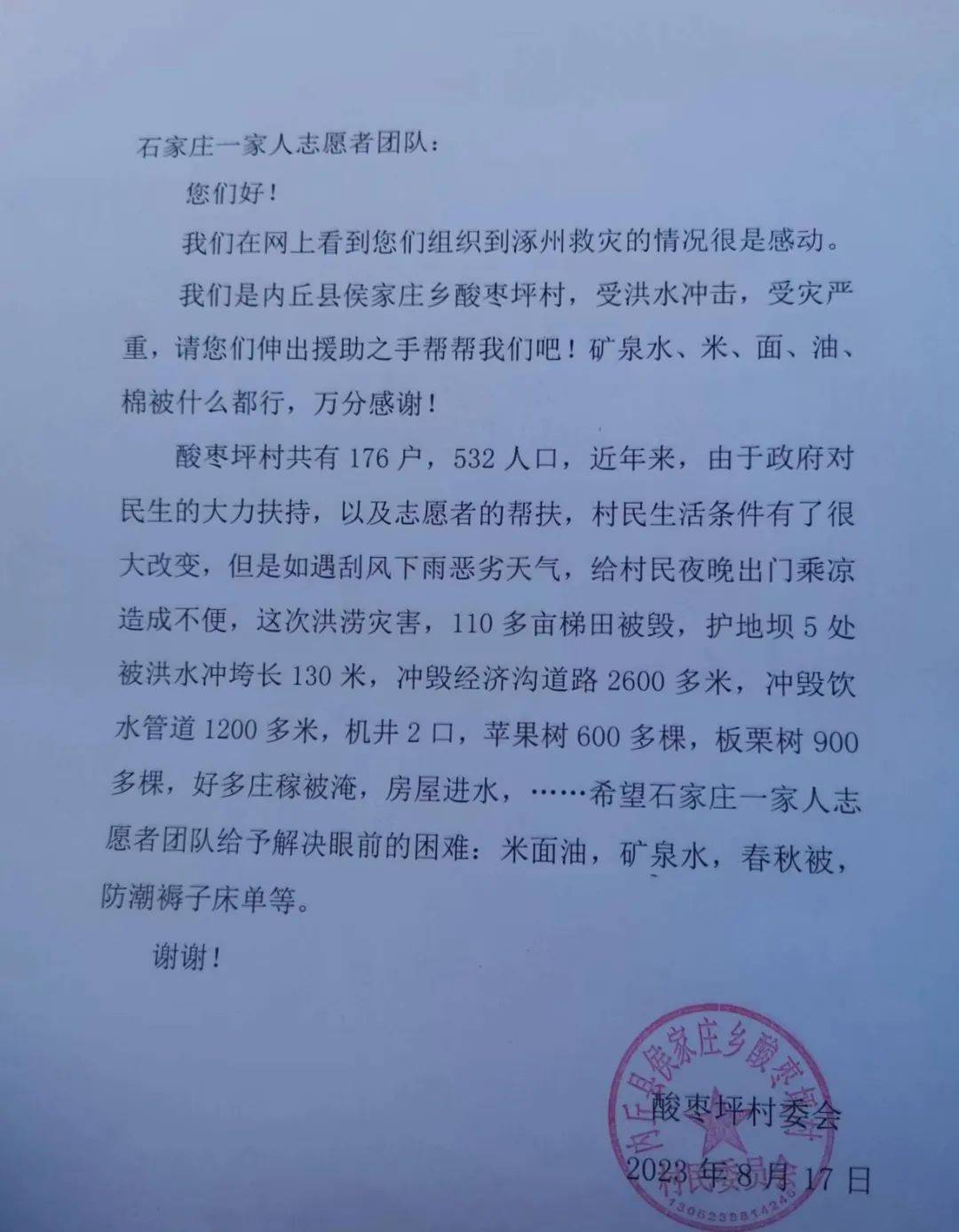 就在8月17日,一家人志愿者团队负责人温德军又收到一封来自邢台内丘县侯家庄乡酸枣坪村党支部书记张的路发来的一封信。信中表达了对一家人志愿者团队善举的赞美,同时希望志愿者们也能够帮帮他们。