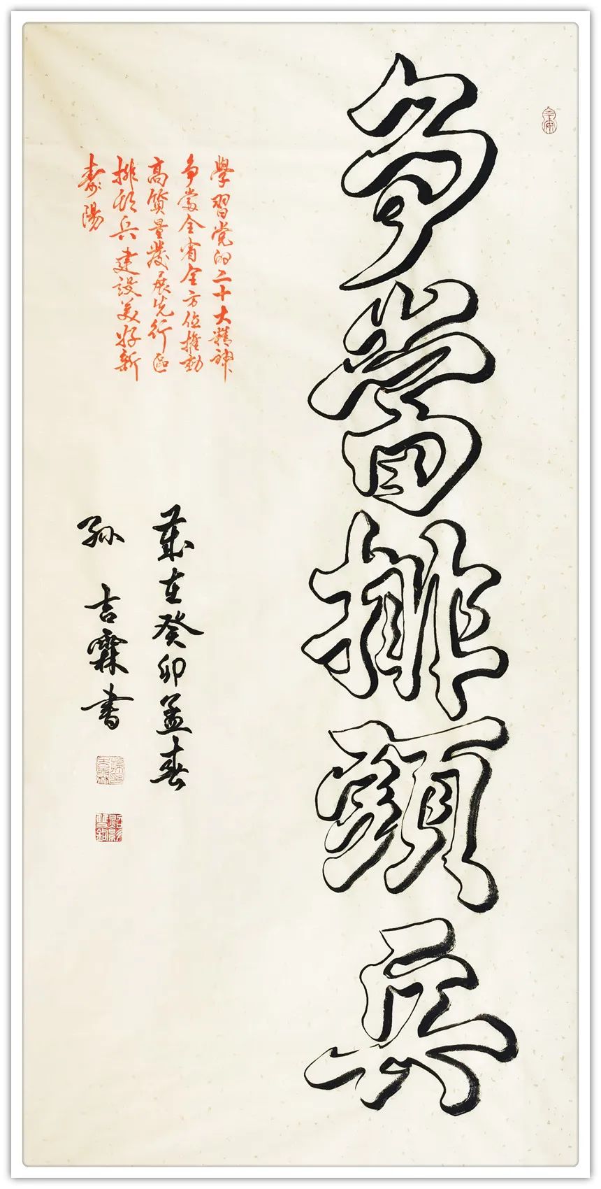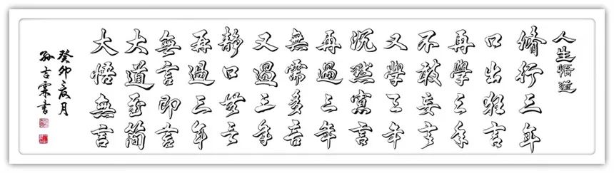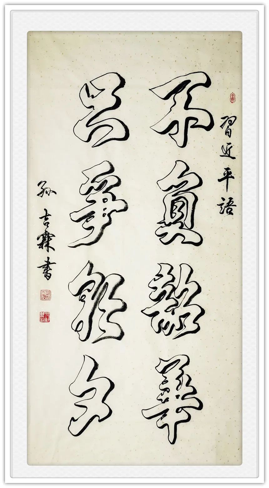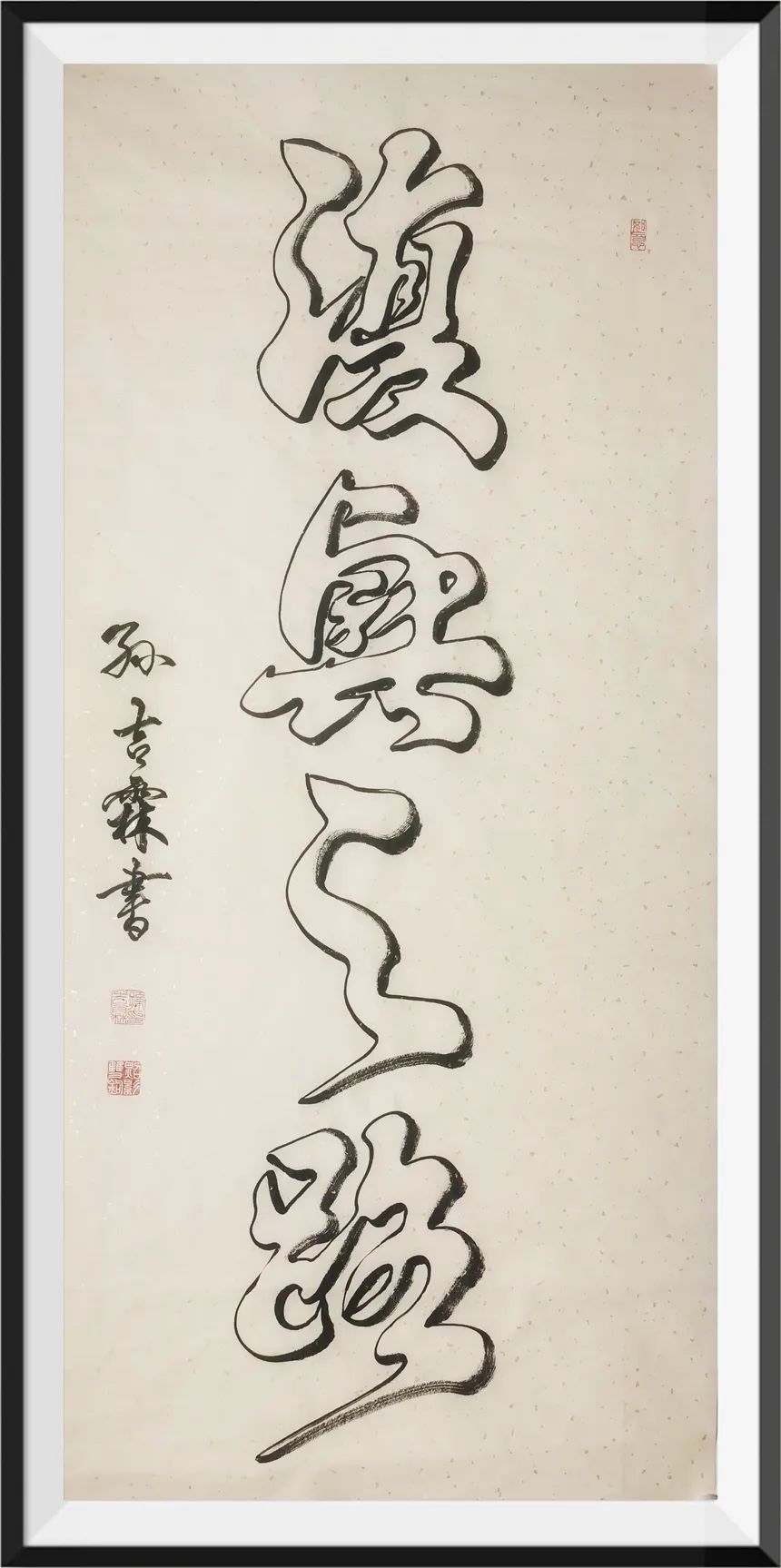 每个时代都有自己的翰墨雄才,晋之二王,唐之颜柳,宋有苏黄米蔡!当代书坛,亦有雄才担当,他既是著名书法家孙吉霖先生!孙先生以卓越的碑帖功夫闻名八方,诸书皆成,博涉多优,行草修养炉火纯青!更有一笔双钩的独家秘籍,功毗冯承素!由是,他既是一位书法技法的磨砺者,也是一位书法文化弘扬的大手笔!观先生之书法,必有大振心颜的视觉体验!笔墨状如鸿飞兽骇,写的是龙跳天门,虎卧凤阙!极有统摄人心的精气神。笔作凌空杀纸,墨作浊浪排空。笔里有墨,墨里有笔,把书法铺陈得如若飘风骤雨惊竦竦,落花飞雪何茫茫!赵子昂有论,用笔千古不易!所谓不易之法,既是笔墨写作万类之像的千变万化。孙先生写行草,恰谙此论,执笔于手,驱笔在心,手向心师,心与笔合,写出的书法线条,必有鸾凤徘徊之姿,也有虬龙蜿蜒之态。落笔痛快,起笔飞仪,当然是同自然之妙有,非力运所能成!站在这样的书法面前仰观,心生感叹:可以在一划之间变起伏于锋杪,也可以在一点之内殊衄挫于毫芒!孙先生的书法,有金书锦字的审美品质,这跟取法为上的磨砺有关系,也与书性超人的表达成因果。书法如果只有取法,无有书性自如的表达,难免匠气,称为书奴。观看他的书法,毫无匠气,师二王而不拘,法米芾而不谨!绝对不作书奴,必有自立面目的勇气和成绩!在锋须往来之间,写得高低有趣。有怀素书法的妙于瘦,铁点银钩,方圆周备。也参意张旭书法的妙于肥,笔墨有气象,丰姿多神!当然,在他的书法里,还可以读到徐渭草书的笔墨磅礴,有骨有内,有劲有气,是谓圣!取历代诸贤的笔墨精神,融会贯通,经营自己的书法灵魂,不遗余力!这是先生的书法有审美品位,有专业境界的重要原因。每遇大展必有高段位奖项,亦有诸多作品成为文化机构的国藏上品,还有作品走出国门成为文化交流的信物,被印制成邮册发行,拥有国家文化名片的资质!一笔双钩绝拍案,翰墨雄才书奇观。孙先生传统书法写得出神入化,又有一笔双钩的法度专享!谈及双钩法,冯承素钩兰亭是佳谈!如今,孙先生借古开今,有别于冯本兰亭铺字而描的“技术性操作”,而是底无蓝本可描,单凭心构空间的强大想象力!是笔线直接钩出华章的新造诣!线作兰亭之风,写得天朗气清,惠风和畅。又有粗细映立体的独特表达,字字可突盈纸面,大有空间质感!这是感性与理性相互加持的书法奇观,望古观今,从未所见。唯有先生可施此法!这样的书法作品,可以装饰万家屏障,成为先生在书坛大颂口碑的见证!品味其书,又有感叹:翰墨渊妙,代不绝人。雄才再现,真实不虚!