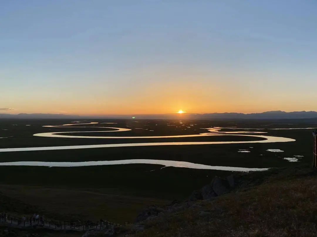 注:“九曲十八弯”是巴音布鲁克大草原通天河的美称,河道弯曲。落日晚霞下,水中可映现出九个太阳。