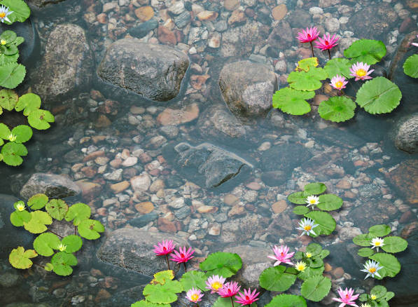 廊下红莲沥眼眸,清香缠绕拱桥头。