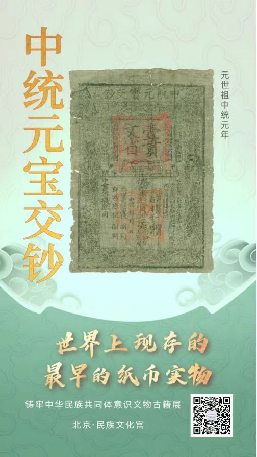 如今,作为世界上留存最早的纸币“中统元宝交钞”,早已远离它流通的年代。它静静地陈列在民族文化宫“铸牢中华民族共同体意识文物古籍展”中,仿佛在为我们讲述元代纸币如何在世界货币制度史上发挥重要作用、如何促进世界货币的变革。“中统元宝交钞”已成为中华民族共同历史的载体,见证了中华民族共同体意识如何在漫长岁月中越铸越牢。