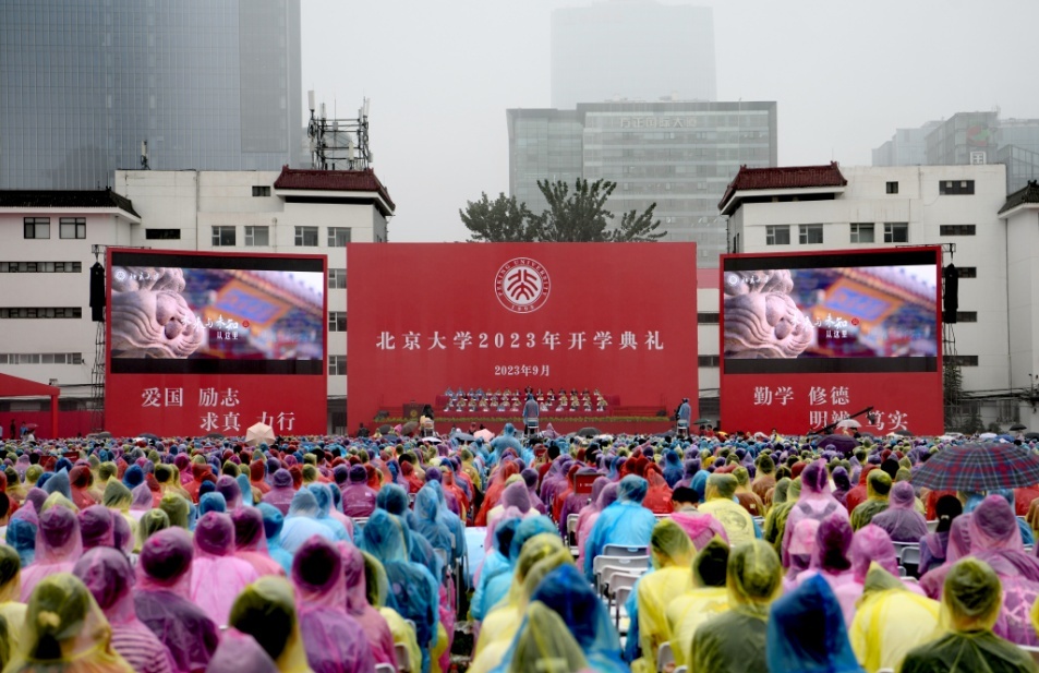 伴着绵绵细雨,北大开学典礼如期而至,新生齐聚五四操场,冒雨聆听校长龚旗煌的“开学第一课”。他以“梦想从学习开始”为题,希望新生学以报国,以天下为己任。他寄语新生:心怀家国理想,勤奋耕耘学业,做新时代的奋斗者,让中华民族伟大复兴在青春的奋斗中梦想成真。