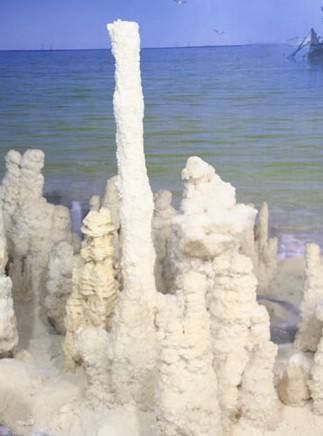 原来,蜃景里扎营修路,完全不像我想象的那么浪漫美妙。盐湖上不仅有高原反应,还有高浓度的盐硝大量蒸发,对人体、物资腐蚀得相当厉害。不到三个月的时间,崭新的棉帐篷就被咬得像纸一样,用指头一碰,就会落下一大块。由于有害气体的刺激,有些战士身上长疮,脸上脱皮,眼晴红肿……那滋味,确实难受的。可说来也怪,环境越是艰苦,战士越会寻找生活里的乐趣,盐石花就是他们在施工中发现的。这种盐的结晶体,各式各样,千姿百态,于是得了一个“盐石花”的美名。