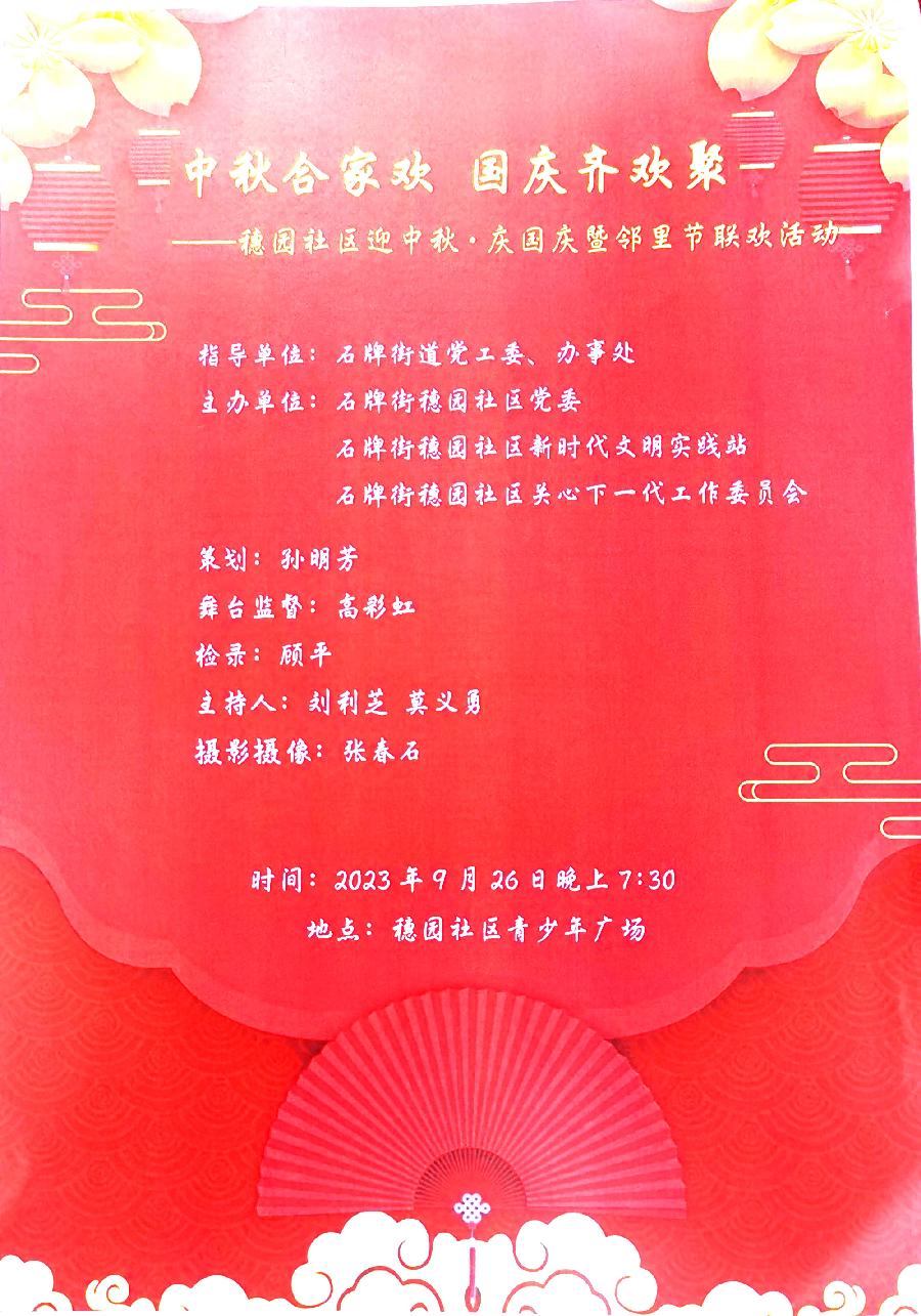 如今,中秋、国庆节日已邻近,穗园社区将在石牌街道党工委、办事处指导下,由穗园社区党委、石牌街穗园社区新时代文明实践站、石牌街穗园社区关心下一代工作委员会主办“中秋合家欢 国庆齐欢聚---穗园社区迎中秋·庆国庆暨邻里节联欢活动”。时间: 2023年9月 26日晚上 7:30,地点:穗园社区青少年广场。