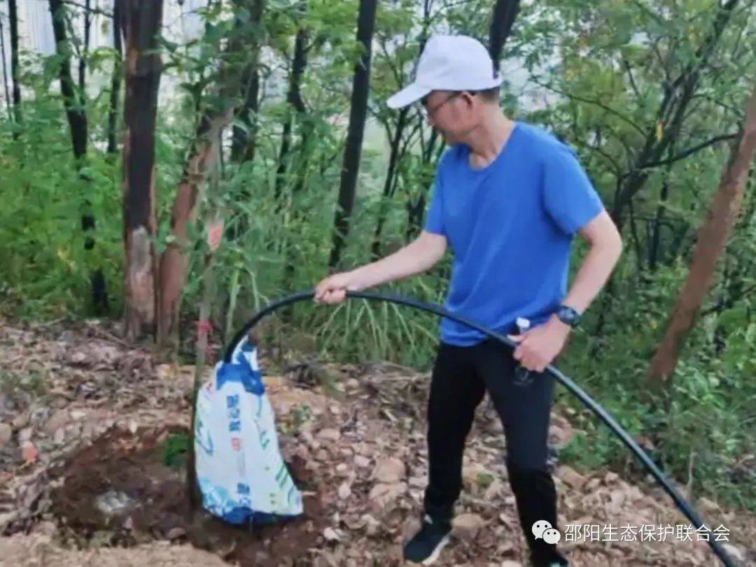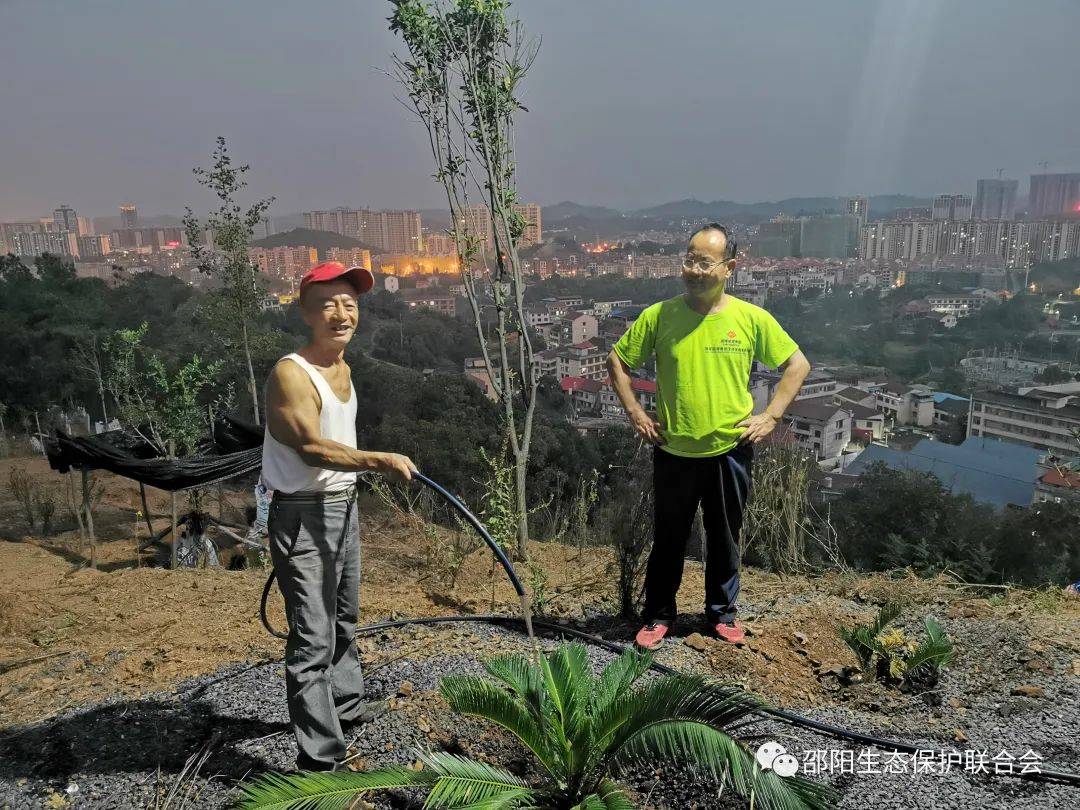 9月25日下午,邵阳市生态环境保护志愿者联合会秘书长胡浴明,带领三位志愿者上山浇树。
