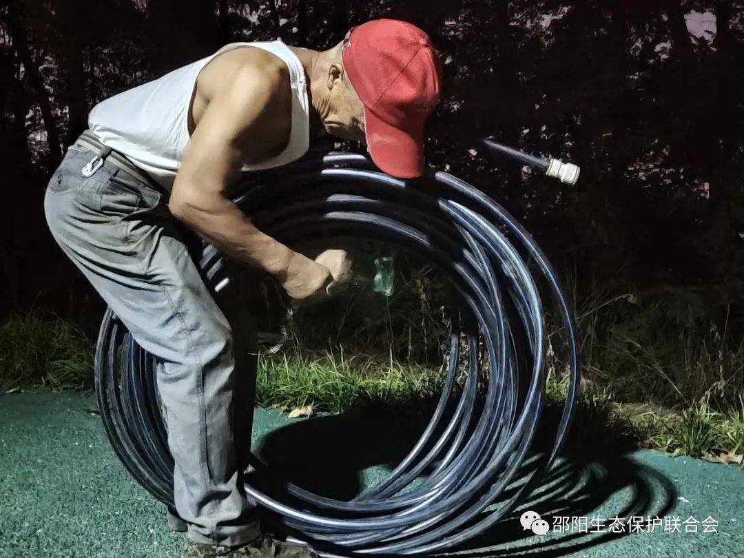 该公益林由邵阳生态保护联合会全程亲力亲为倾情打造。为了防止暑旱灾害,特意买来高压提升水泵和塑料软管,并联系好山下村民供水供电,将自来水直接抽上山,浇透树根后再灌满滴水袋,确保半个月不受旱害。