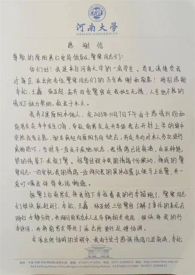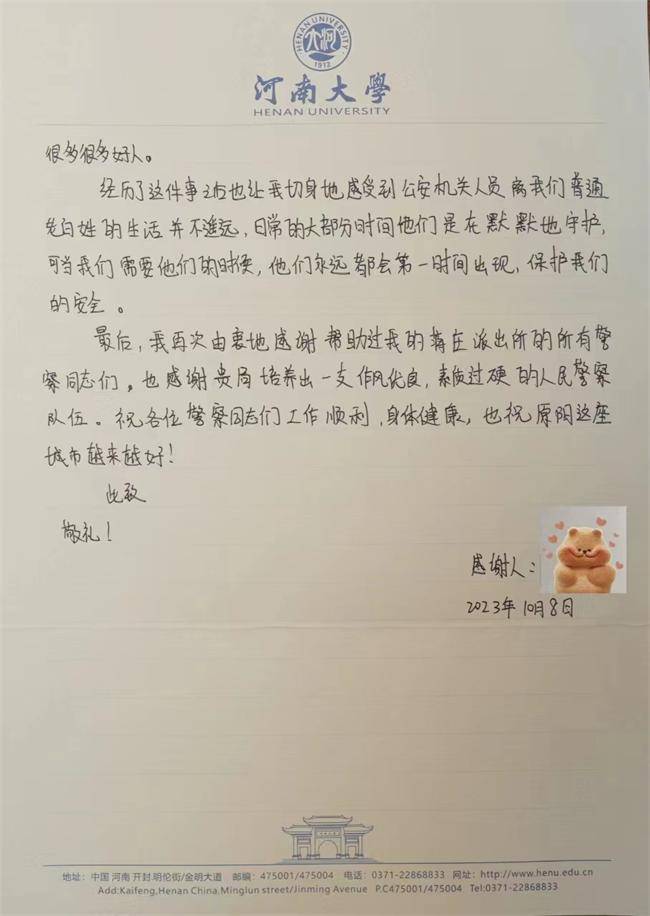 近日,原阳县公安局收到一封来自河南大学一名学生的信件,内含一封手写感谢信,字里行间的纸短情长、情真意切,这些包含深情的赞许和鼓励既是对原阳警方辛勤付出的高度认可,也是激励民辅警再接再厉的强大动力。