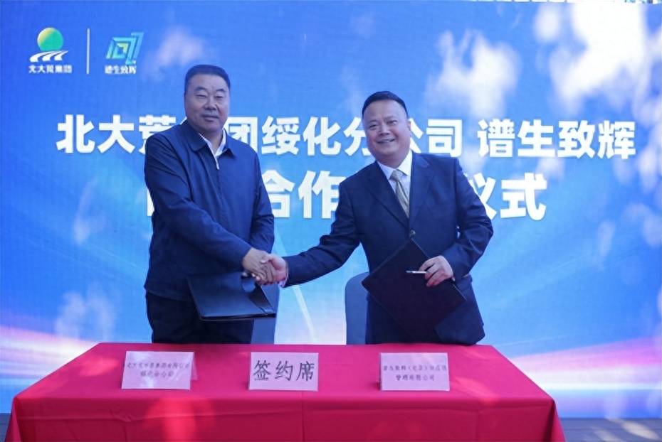 图说: 北⼤荒集团绥化分公司营销部总经理吴俊学与谱⽣致辉(北京) 供应链管理有限公司董事长刘家欣签署战略合作协议。
