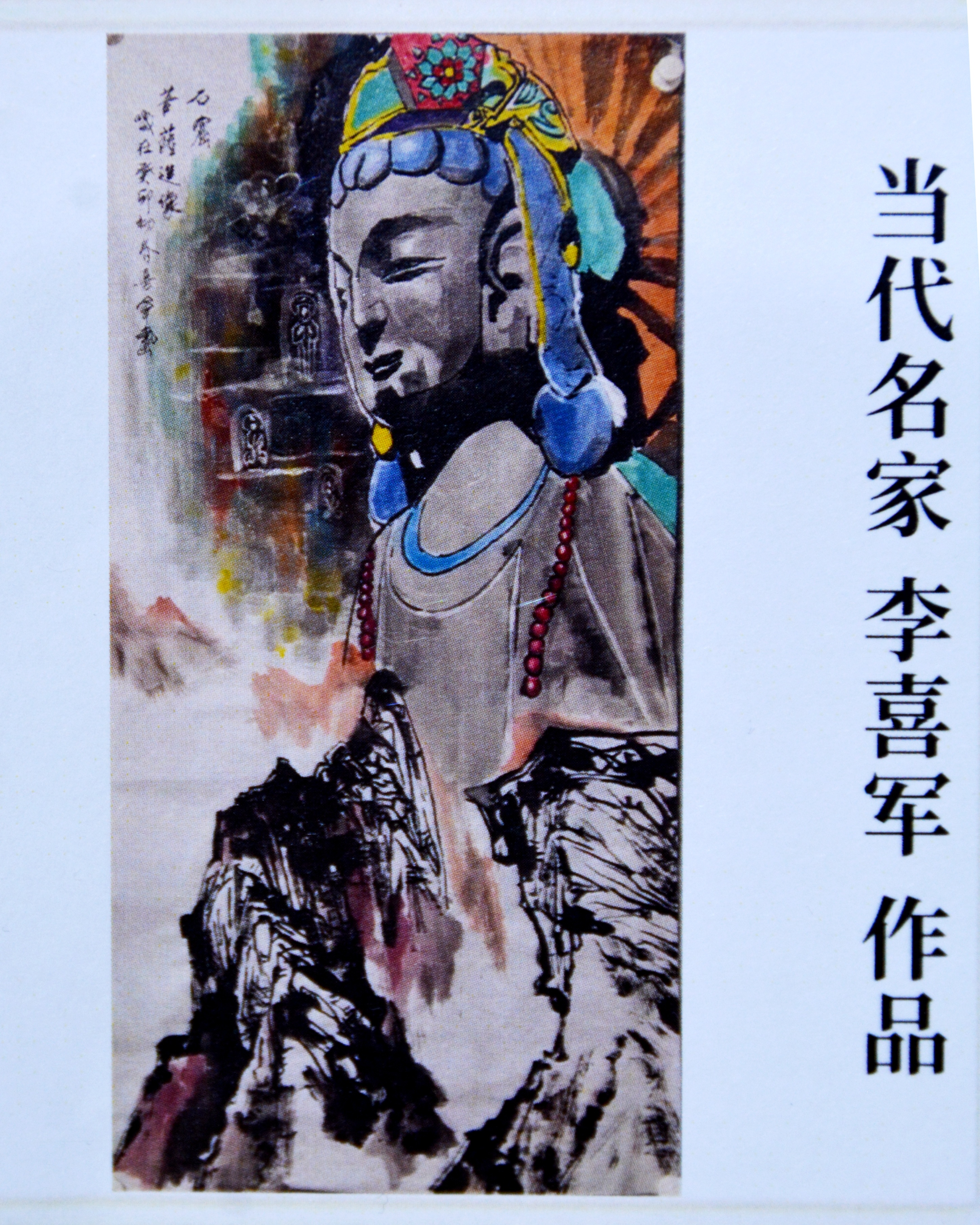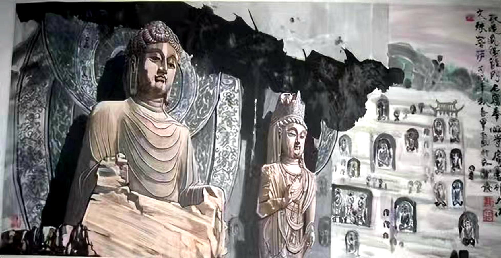 李喜军从绘画上来说,艺术家不管采用绘画还是雕塑的手段,都始终表现的是他们意象中的佛教形象符号。李喜军的绘画艺术,正是利用中国画的笔墨材料,采用现代摄影的构图方式,直接面对龙门石刻遗迹,营造出了西画般强烈的明暗、透视、立体艺术效果,既具有石刻艺术的坚实质感,又不失绘画艺术的唯美形式。在水墨的运用过程中又融入了素描关系的准绳,对水分的应用更是到了随心所欲,尤其是在佛像发髻处,逐一地皴擦,让精简线条的佛像本身在宣纸上呈现前所未有的恢宏气势;还有具象佛像的背景,李喜军大胆地运用了“飞天”、“碑帖”、“浮云”等元素,实与虚的结合,凸显了佛像的佛家光辉,彰显了中华文明,更是画家思想的全面展现。这是对传统艺术理念的大胆革新,也是对水墨艺术表现力的开拓与发掘,表现的完全归属神圣的宗教类题材。