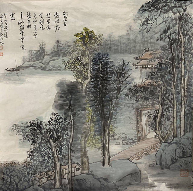在继承传统,消化传统上,张筱玲确实下过一番功夫。为了得到更大更高的提升,她后来又转益多师,拜在董继宁、周韶华等老师,对山水的用笔用墨,亦有了更多更新更深的理解,并渐渐进入了心手双畅的创作佳境。 经名师点拔与熏陶,张筱玲在笔墨上可谓尽得风流。不仅善于用笔,亦善于用墨用色,尤其善于根据不同山水,运用不同的墨与色,来表现岀山水的层次、内涵与神祕,她笔下的画面十分美,既俏丽又飘逸,又能凸现山水的意境与韵味。彩墨酣畅,满纸氤氲; 刚柔并济,柔中呈刚。用笔用墨老辣遒劲。
