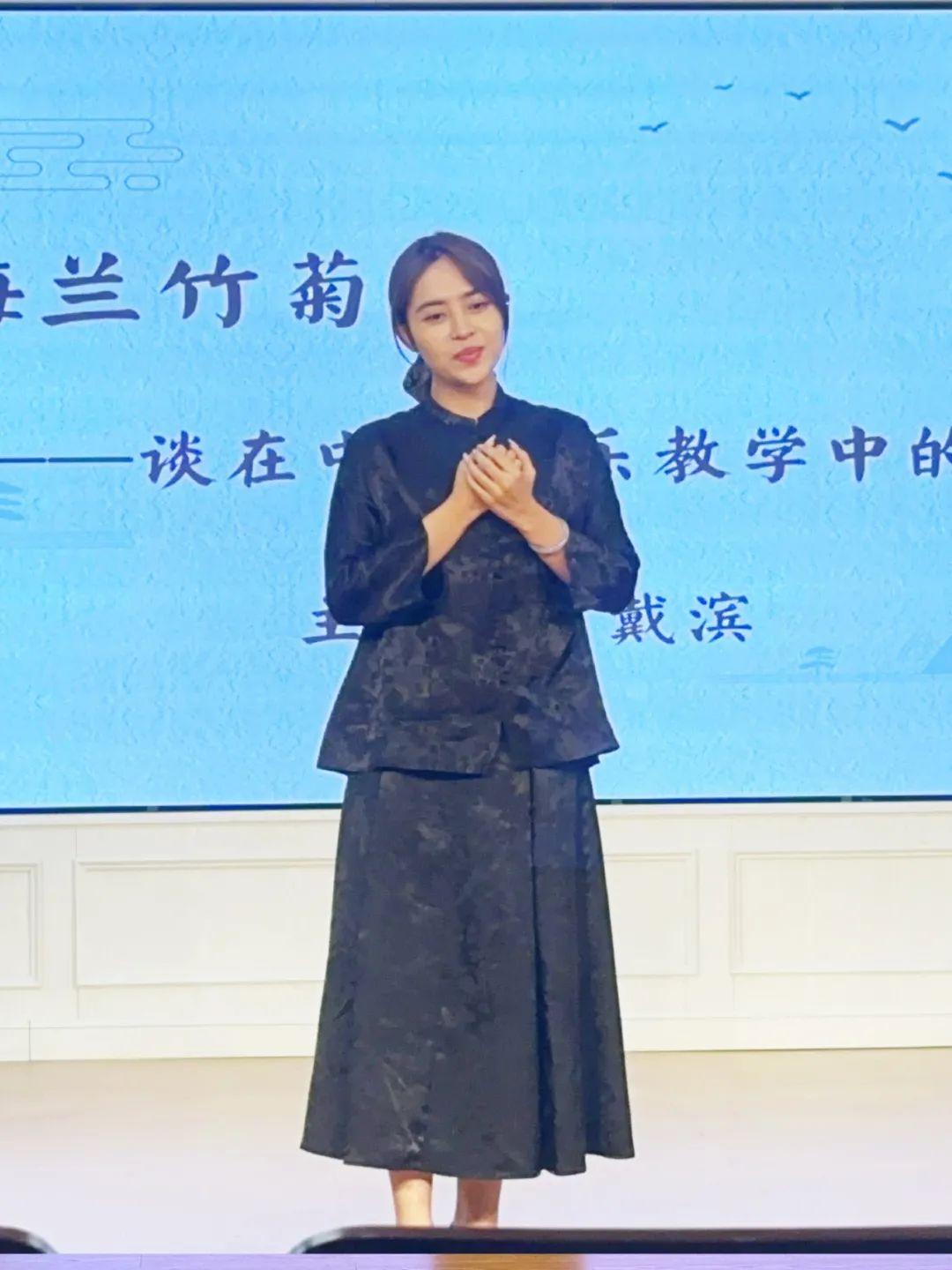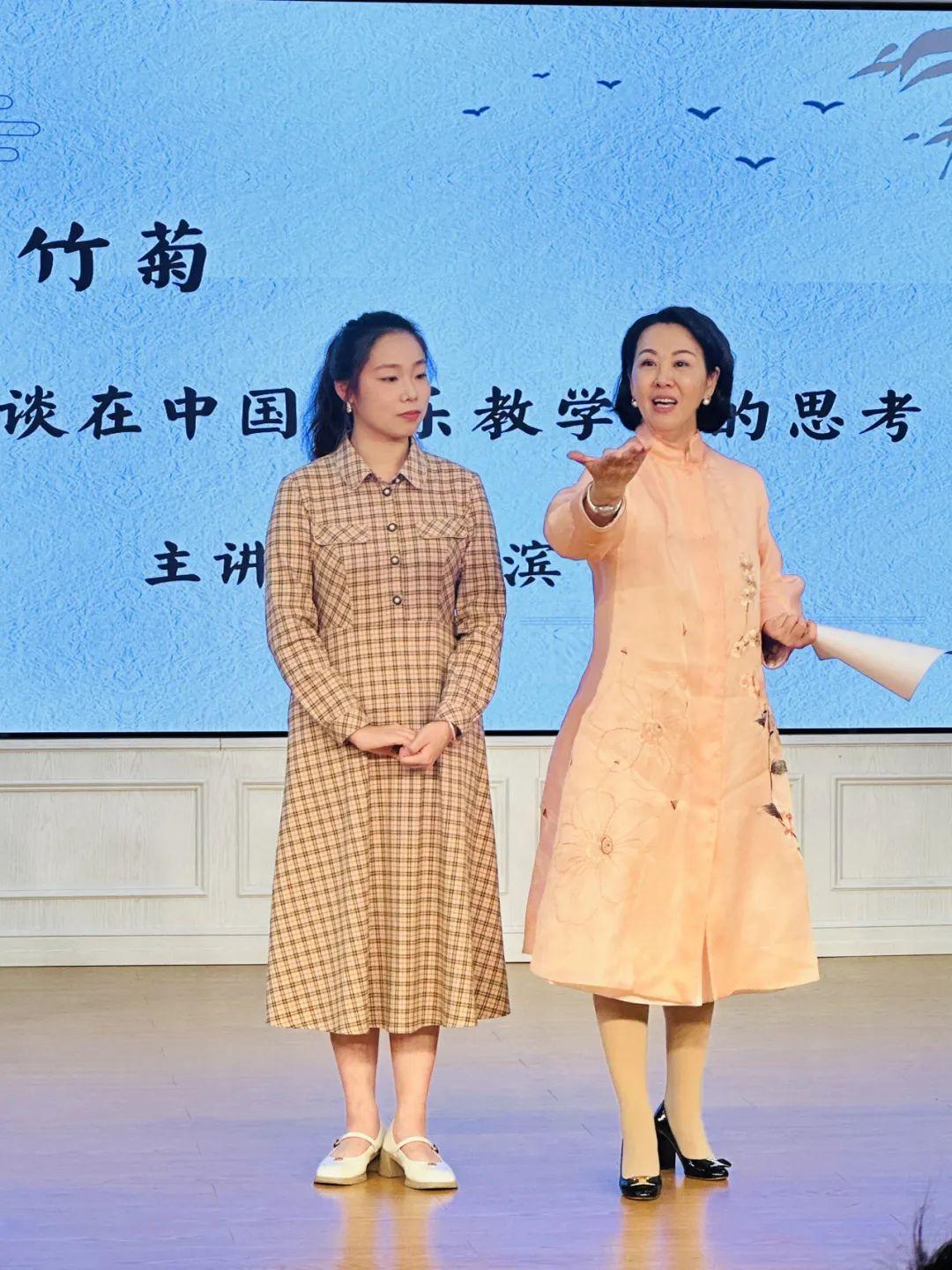 讲座过程中,戴滨教授循循善诱、精准指导,让聆听的学生和老师受益匪浅。多年来,戴教授立足共性化声乐训练的基础,进行个性化演唱风格探索,积极挖掘演唱者身上最独特的闪光点,教学手段灵活多变、因材施教,形成了独具特色的教学风格和教学方法。她提出的“在对立矛盾统一的辩证思维中平衡点线面的声音构架”“情境设计结合深悟作品内涵启发式引导式教学”“个性化挖掘与演唱风格定位”等教学理念,快速有效地解决了声乐教学难题,拓宽了教学思路,提高了演唱水准,更是培养出众多在“金钟奖”“文华奖”“CCTV青歌赛”“全国高等艺术院校声乐大赛”“国际华人艺术节”等国内外重大比赛中获奖的声乐表演人才和各大高校、教育系统的优秀声乐教育工作者。戴滨教授学生共同创建“戴上金花”艺术实践团队,打造“音画乐间·梅兰竹菊系列音乐会”艺术实践品牌,力求植根于中国声乐的传承与发展,为学生的艺术实践发展提供更多的平台。