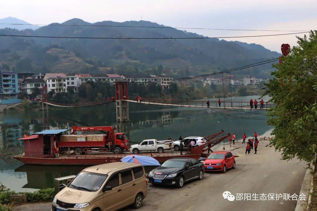 志愿者们第一站来到有着宝庆十二景美称的"石门献翠"。石门山在新邵县城西12公里,两岸悬崖绝壁,奇岩兀立,怪石嶙峋,青峰如削。明参政车大任《石门山》诗云:"遥空千嶂立,夹岸两峰攒。春雨洗初碧,朝霞染更丹。中流回急溜,乱石走飞湍。险阻知天设,躜岏万古看。"此处名铜柱滩,是资江第一最险滩,弯陡,水急,当年不少宝古佬毛板船到此,不知多少次船毁人亡,上演了多少人间悲剧。当年曾随父亲驾过船、闯过险滩、今年68岁的志愿者申群韩至今回想起来仍然后怕。