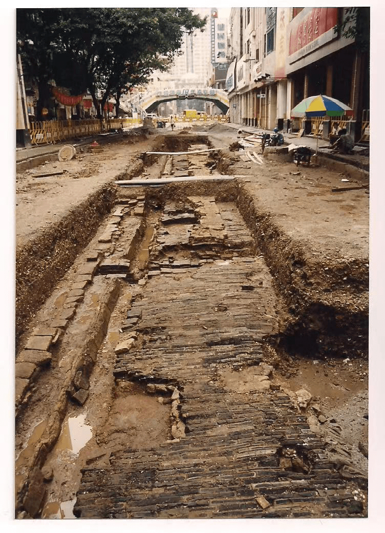 1988年9月到11月,广州市考古队在中山五路百货商店(新大新公司)建筑工地,地表以下七米处,考古发掘清理出一处南越国时期大型砖砌池状建筑遗址,出土万岁瓦当半两钱等一批文物。