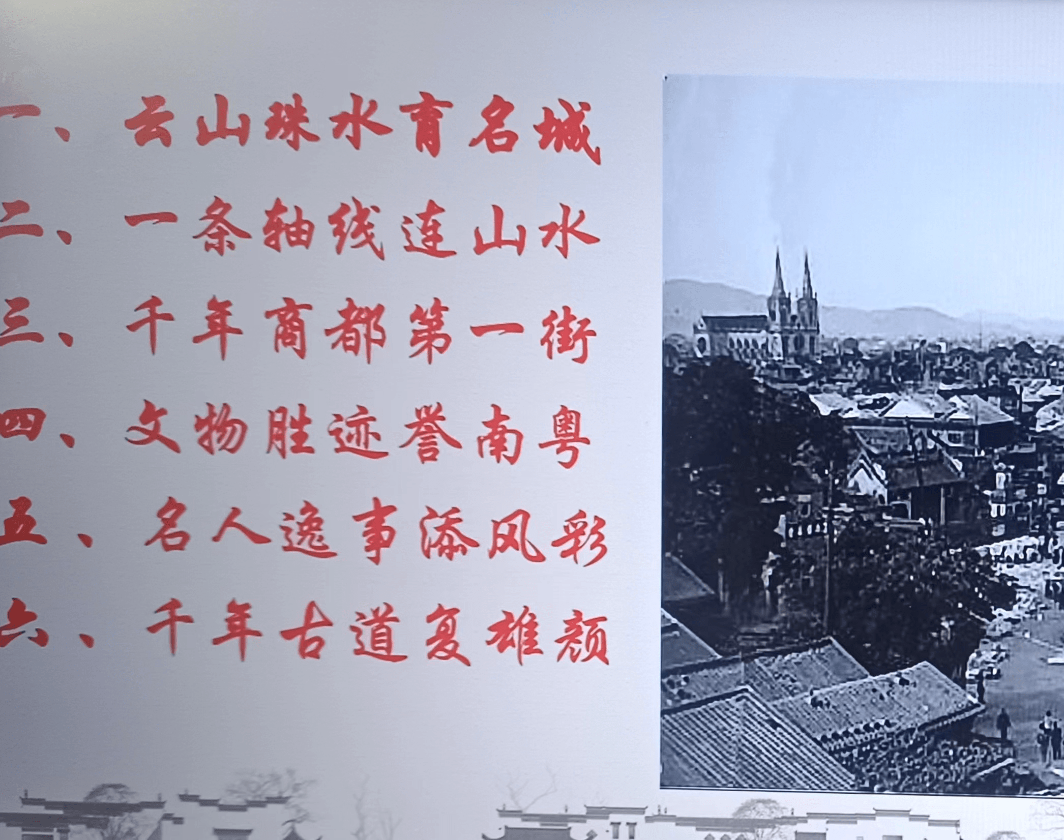 讲座分为6个部分:一、云山珠水育名城,二、一条轴线连山水,三、千年商都第一街,四、文物胜迹誉南粤,五 、名人逸事添风彩,六 、千年古道复雄颜。