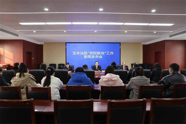 12月28日上午,宝丰县人民法院召开“府院联动”工作新闻发布会,通报了今年以来该院“府院联动”工作取得的成绩。院党组成员、政治部主任李亚鹏,党组成员、副院长张建立参加发布会。河南电视台等媒体记者及群众代表应邀参加。