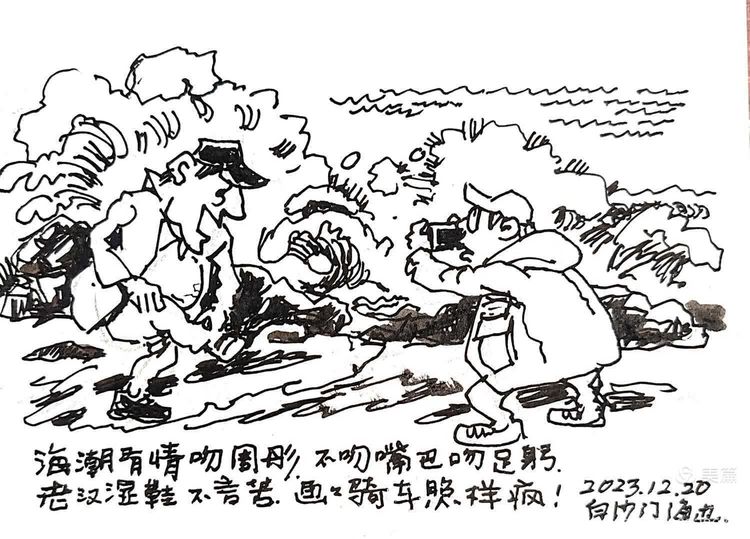 我画这张画时,遇到从武汉来海口越冬的老太太,她92岁,是抗美援朝的老兵,她说画家画画的地方,都是很美的,我们和她一起合影,九十多的人还如此健康爽朗,真是难得。