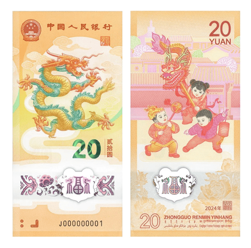 龙年是传统生肖大年,新年新气象!2024年贺岁纪念钞是央行发行的首枚贺岁题材纪念钞,延续冬奥钞的竖版设计,纪念钞正面主景为龙的造型图案,搭配光彩光变面额数字“20”与汉字“贰拾圆”动感全息图案,背面主景为儿童舞龙灯图案,辅以北京四合院民居装饰图案,营造出浓郁的新年贺岁氛围。