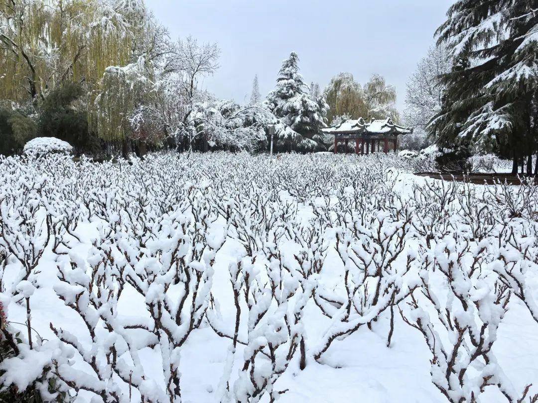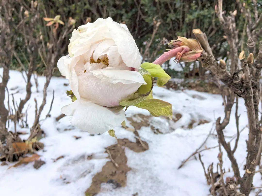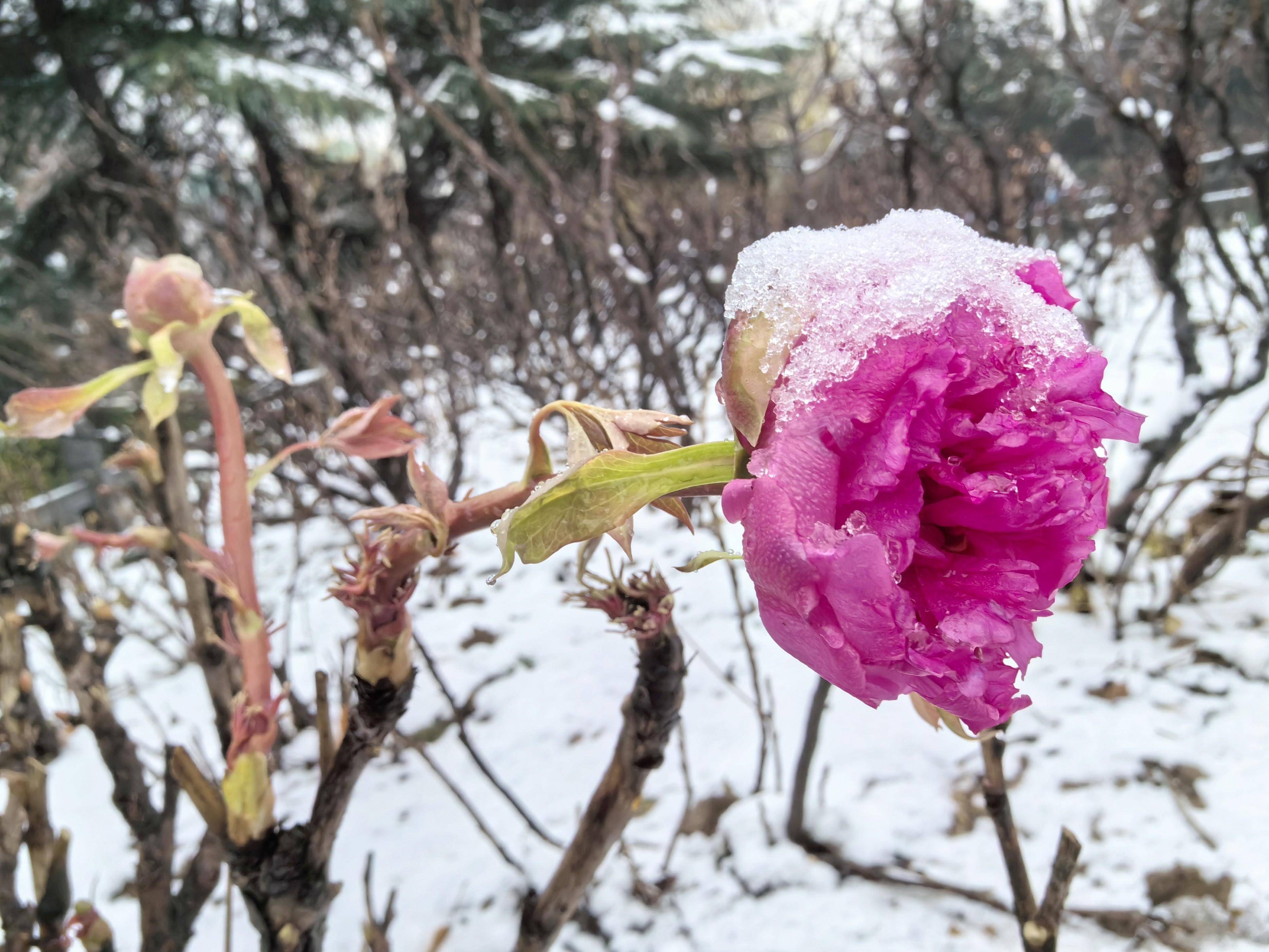 大雪纷飞,银装素裹,天地苍茫,万物沉寂。在洛阳西苑、王城公园、周王城广场、隋唐城国家公园、隋唐城遗址植物园、中国国花园各有几枝牡丹傲雪开放,无畏严寒冰雪。走到冬日开花的牡丹旁,细细欣赏,牡丹依然不减其“花王”风范,雍容华贵,国色天香。我忽然联想到武则天贬牡丹的传说,联想到苏轼冬日赏牡丹,联想到乔羽先生的《牡丹之歌》,联想到新时代牡丹花开随人意。