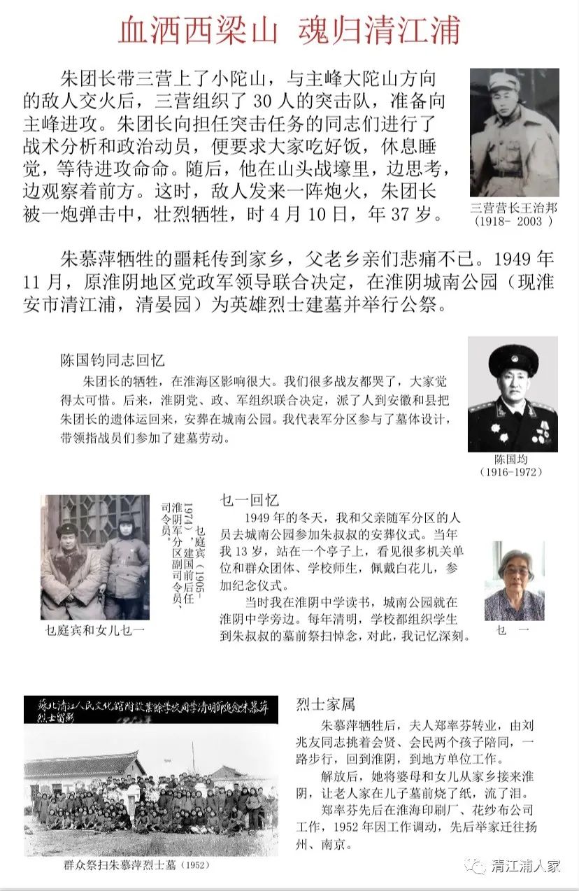 【编者按:读小学时,每到清明,学校会组织师生走进清宴园(那时叫城南公园)祭扫烈士墓。彼时对墓碑上“朱慕萍”三字的认识仅限于“烈士”二字。数十年后,有幸拜访了烈士子女,并得以阅读烈士夫人郑率芬女士写的《朱慕萍传》。至此,对渡江战役中牺牲的最高级别指挥员朱慕萍烈士有了比较全面直观的认识,对烈士次子朱会民先生数十年如一日踏遍大江南北找寻父亲足迹的壮举甚是钦佩。今天,这个特殊的日子,我们再次走近英雄,缅怀先烈。