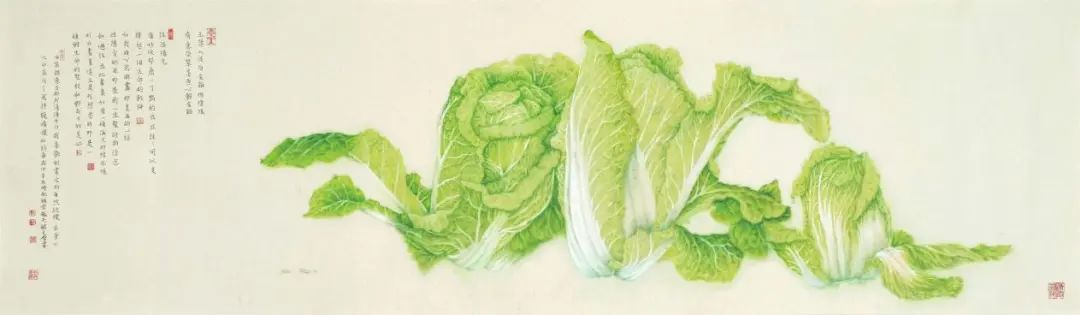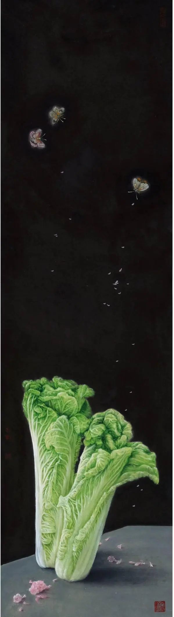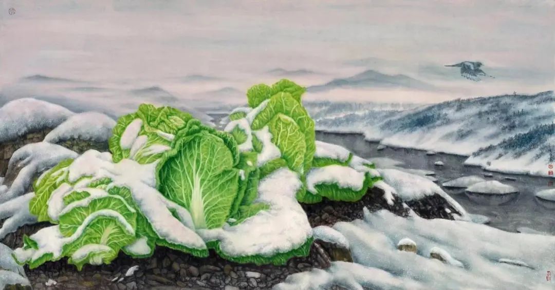 今天,我们一同走进龙文会先生的白菜系列,这是一场属于菜地的春天,一场对白菜的颂歌。《春回大地》是龙文会先生的白菜系列的佳作。画中是一块菜地,满眼都是成长中的大白菜,有大有小,作者以细腻的笔触描绘了白菜嫩绿的叶片,展示了它们生机勃勃的长势。满地大白菜的一隅,仿佛春天的音符,奏响了大地回春的乐章。 画家在此画作中,进行了细腻入微的描绘,将白菜的每一片叶子都画得栩栩如生。“白菜一枝春欲尽,田间已种满头归。”勾勒出一幅清新而宁静的画卷。在这片“白菜花海”中,人们仿佛听到了春天的脚步声,感受到了生命的盛放。对于很多总是脸上堆满忧愁的朋友来说,或许我们应该要像大白菜一样茁壮成长,对生活充满希望与活力,努力向阳而生。 在《百财传家》中,龙文会先生通过黑白色调的山水画作为背景,将一张木色桌子上的蓝色绸缎、古董花瓶、数只成熟苹果和一棵大白菜妙趣横生地融为一体。这一幅画作透露着浓厚的艺术氛围,仿佛是一场百财传家的盛宴。 这幅佳作,体现了画家对色彩的巧妙运用,不同物品的颜色,配上墨色山水画作为背景,使得画面更显层次感。“传家青白凛寒冰,种得畦蔬积雪层。”在这个画中,大白菜不仅是物质财富的象征,更是艺术之美的见证者。每一棵白菜都是大自然的杰作。它们在土壤中扎根,汲取着丰富的营养,然后在阳光和雨露的滋润下茁壮成长。或许,我们应该和大白菜一样,学会静静守望,传承百财,幸福永远。 这幅画作呈现着三棵形态各异的大白菜,象征着多样的财富渠道。画中的白菜千姿百态,生机盎然,让人不禁感叹大自然的神奇之处。画家以轻盈的线条勾勒出白菜的形态,传递了多元的生命力。“玉质喜为邻,窥园日欲亲。”这幅画作让人联想到丰收的季节。在这个画面中,我们仿佛看到了财富的源泉,涌动着生命的活力。想拥抱多样的生活,必须要寻找多渠道的财富,只有这样,才能够让我们的生活更加丰富多彩。 此画作,黑色的背景上方有三只五彩斑斓的蝴蝶在飞舞,大白菜立于灰色桌面,粉红色的花瓣点缀其间。画面中透露着一种空灵和轻盈,仿佛是大白菜的梦幻舞台。画家的绘画特点在于对色彩的独特运用,使得整个画面如梦如幻。“晚菘细切肥牛肚,新笋初尝嫩马蹄。”在这个画中,大白菜仿佛是梦幻仙境中的仙子,原本普通的大白菜,仿如尊贵的艺术品,引领我们进入一个诗意的世界。生活即使有各种不如意,但我们始终要积极向上,要善于发现生活中的美。学会拥抱梦幻和轻盈,让生命充满诗意与浪漫。此画作,有一种特殊的唯美味道。大自然的美景被龙文会先生生动而细腻地表现出来。雪后的大白菜依然在地里顽强地生长,叶子覆盖了一层厚厚的雪花。远处,群山被云烟轻轻笼罩,勾勒出一片宁静而神秘的画面。此时,一只展翅飞翔的鸟儿正从此处经过,似乎在追逐着生命的奇迹。 画家比较擅长通过对雪景的巧妙描绘,然后衬托出主角大白菜,使得整个画面充满了清新的气息,让人在画面中感受到大自然的宁静和神秘。大白菜在这里起到了画龙点睛的作用,是这片雪域中的亮丽存在。生活说难也难,说容易也容易,主要是在于我们的心态。不管生活如何对待我们,我们都要勇敢地面对生活的风雪,用坚韧的姿态迎接每一个挑战。 淡绿色的背景,原木色桌面上摆放着两棵新鲜的大白菜,叶子上还挂着水滴。一只蜗牛悠然地在白菜叶子上爬行。桌面还有一盘成熟的葡萄,另外两颗葡萄似乎掉落在桌上,根茎连在一起,形成一幅清新可爱的画面。画家在这幅作品中,对细节进行了精致描绘,使得画面充满了生活的真实感。“畦蔬甘似卧沙羊,正为新经几夜霜。”在画作的寓意中,大白菜不仅是食物的象征,更是生活的美好。看了此画作,让我们明白了一个道理:做人,要像大白菜一样,保持清新的心态,悠然自得地在生活中行走,让每一刻都充满生命的美好。 可以说,龙文会先生的白菜系列呈现出了一场对生命、对自然的赞美之歌。每一幅画作都独具特色,以其深刻的内涵、精致的技巧和美好的意境,为观者带来了一次心灵的洗礼。或许,在每一片大白菜的叶片背后,都蕴藏着一段生命的故事,而龙文会先生通过他独特的艺术表达方式,让这些故事在画面上得以绽放。