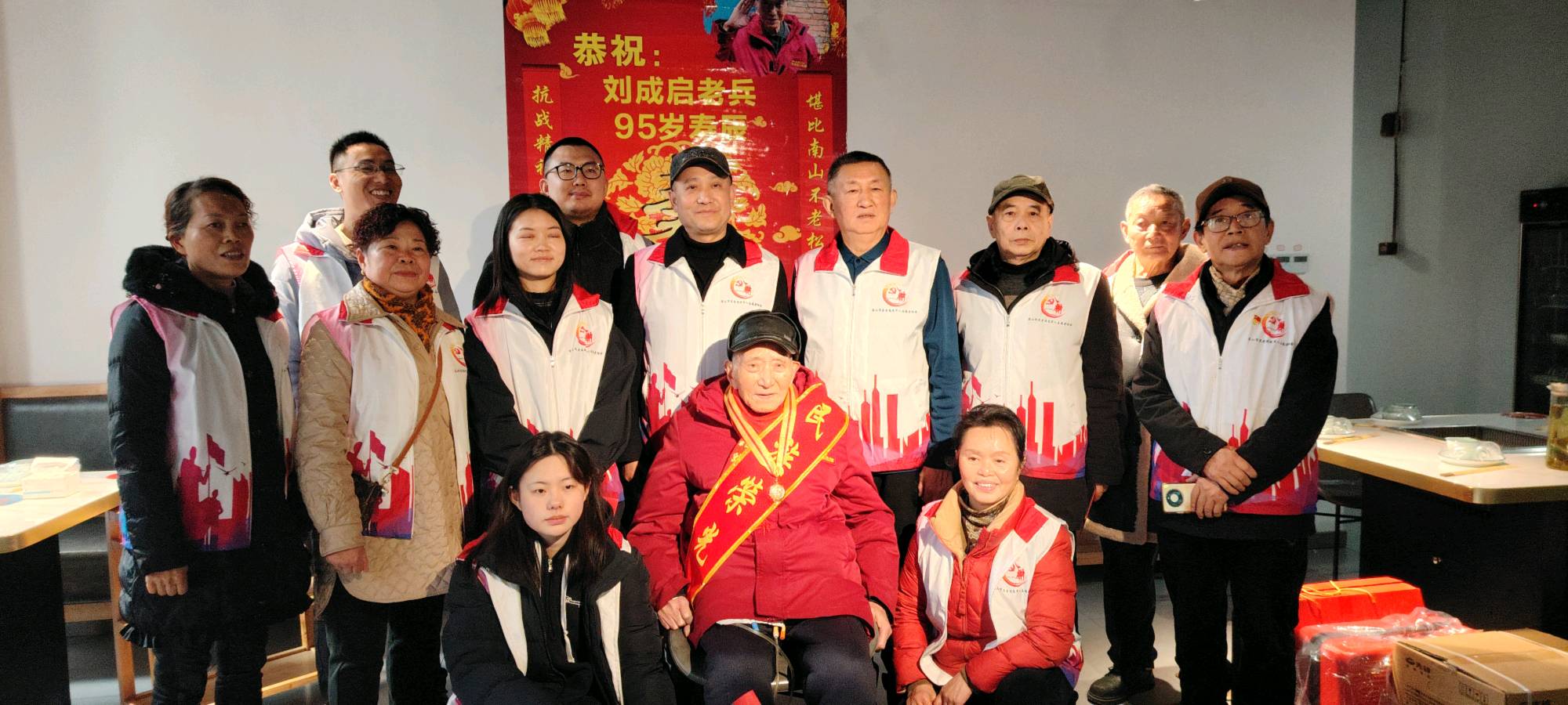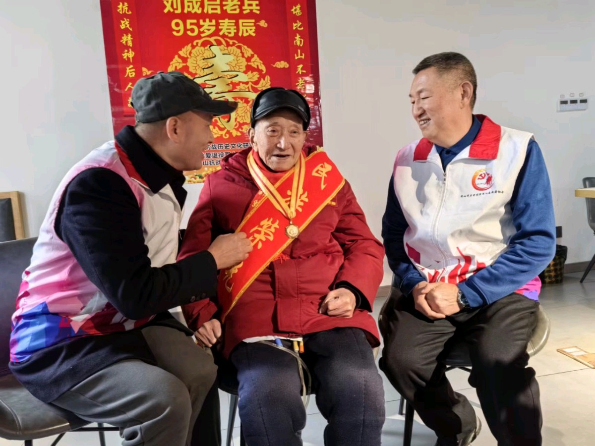 慰问队伍最后来到抗战老兵刘成启95岁生日庆贺场地,举行了一场隆重热烈的庆典。刘老及亲属与慰问者摇动小国旗,齐唱《五星红旗》,场景十分感人。