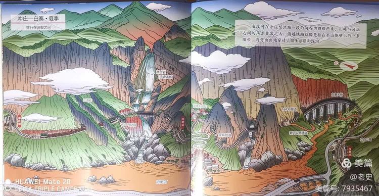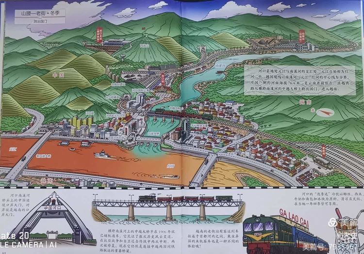 书中画出了这条铁路全程的走向和地貌。其中每一段轨道,每一个车站,每一座桥梁都画得清清楚楚。而因为山高险阻,当时无力开凿隧道,便在山上像盘山公路一样修了绕来绕去的(延)展线,展线也在途中画得清清楚楚,说得明明白白。这本画册将这条铁路从起点昆明起,越过中越边界河口,一直画到越南的海防止。其内容让我这个稍懂一点铁路知识的人看了一目了然。