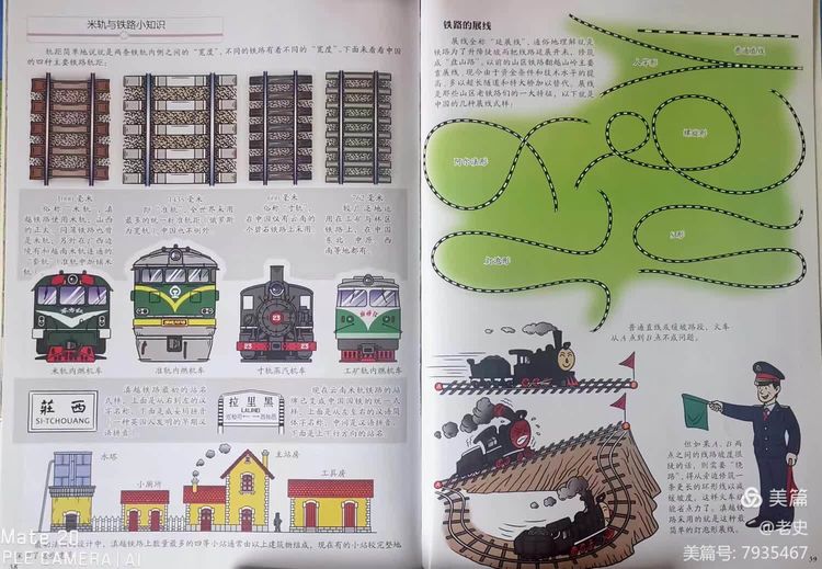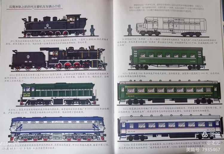 我看了看,原来这本书是本儿童绘画本,书名叫《百年米轨的故事——滇越铁路之旅》,作者丁目也是小梁的铁哥们。说是儿童画本,但是内容可不简单,这本书全面介绍了110年前由法国人在越南海防和中国昆明之间修建的米轨铁路。这是中国西南地区的第一条铁路,同时也是一条国际铁路。铁道兵走到哪里,都会给当地遍个“十八怪”,云南十八怪中就有“火车没有汽车跑得快”和“火车不通国内通国外”的说法。其实这两怪把滇越铁路的精华概括出来了。