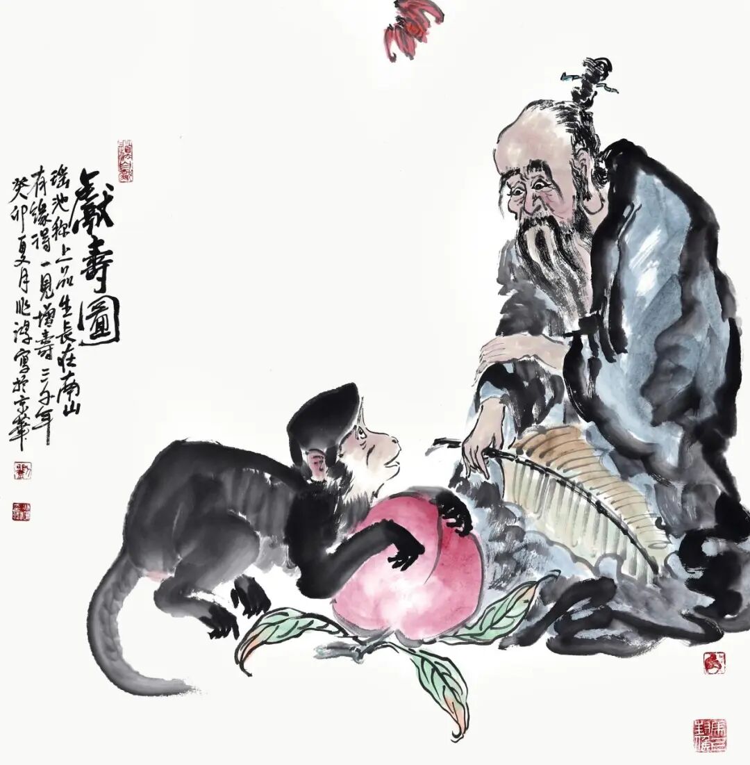 “献寿图”中,以老人和猴子为主角,生动地描绘了他们与桃子之间的互动。画面中的老人面带微笑,眼神慈祥,似乎在享受着与猴子的亲密时光。猴子则手捧桃子,欢快地跳跃着。这种人与动物和谐相处的场景,传递出一种温馨的情感和美好的寓意。 此画作的主题是献寿,即祝福老人健康长寿。这种祝福的寓意在中国的传统文化中有着深厚的历史渊源,通过绘画的形式表达了对长辈的敬爱和祝福之情。“青鸟衔书昨夜来,蟠桃如斗核如杯。”人生暮年,白发朱颜,回望一生的沧桑与美好,我们为亲爱的长辈们献上最深切的祝福。愿他们在晚年喜乐无穷,福寿绵长,儿孙满堂,共享天伦之乐。