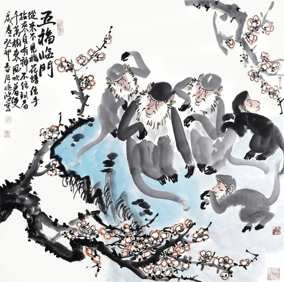 “五福临门”画作,五只猴子在梅花树上欢腾跳跃,生动活泼,其中四只猴子嬉戏玩耍,而另一只大猴子则静静地欣赏着盛开的梅花。这种鲜明的对比,使得画面充满了动与静的和谐。“五福临门”四个字,更是为这幅画作增添了几分吉祥的寓意。画作通过巧妙的布局,将五福临门的寓意与猴子在梅树上的欢腾场景完美地融合在一起。色彩的运用也十分出色,将猴子的灵动、白梅花的娇艳以及树干的苍劲表现得淋漓尽致,更加衬托出“五福临门”这个寓意。“春风吹乐五福来,福禄寿喜多花开。”心中充满阳光,那么这个世界就不会有阴暗。让春风的温暖抚平你的忧伤,让五福的祝福常伴你左右。