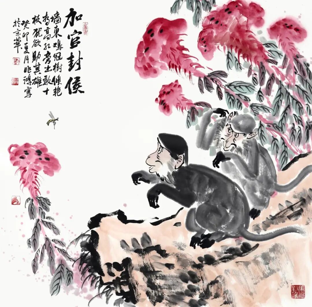 “加官封侯”中,画面中的两只猴子成为主角。它们站在石坡上,一只猴子在玩乐,活泼可爱。另一只猴子看到了不远处的一只马蜂。猴子,跟马蜂在一起有马上封侯之意,跟王侯将相的侯是谐音预示着官禄恒通,仕途顺达加上画中的鸡冠花,又有加官封侯之意。画面中的粉色果子挂满树枝,与绿色的叶子形成对比,给人以视觉上的冲击。红色的果子代表的是成功。配上“加官封侯”四个字,寓意着观者很快就能够获得更高的地位和荣誉,好消息即将到来。“两朝出将复入相,五世迭鼓乘朱轮。”梦想的路上或许艰难险阻,但只要坚持努力,终有一天会加官封侯,光耀门楣。