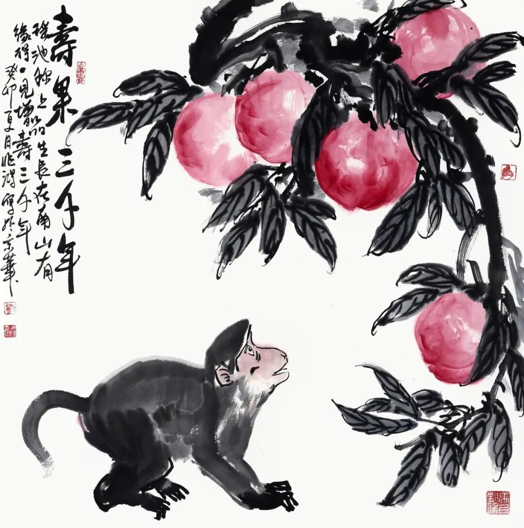 《寿果三千年》画作,一只栩栩如生的猴子跃然纸上,眼巴巴地在一旁观望,垂涎欲滴。这种生动的描绘,无疑将猴子的灵动与机智表现得淋漓尽致。更为引人注目的是,画中的桃子被赋予了特殊的意义,象征着长寿与福气的“寿果”。在传统文化中,桃子常被用来寓意长寿,所以桃子在画作中常常被用作象征长寿的元素。这幅画作的构图巧妙,色彩丰富,猴子的形象栩栩如生。从技巧上看,画家运用了精细的线条和丰富的色彩,将猴子的神态和桃子的质感表现得淋漓尽致,让人仿佛可以闻到桃子的香气,感受到猴子的灵动。画作将猴子的形象与寿果的寓意巧妙地结合在一起,通过生动的描绘和巧妙的构图,传达出对长寿和美好生活的向往和追求。“蟠桃已熟三千年,海屋筹添九十春”在猴子的世界里,我们可以看到自然界的和谐与生命的律动,感受到生命的力量与美丽。
