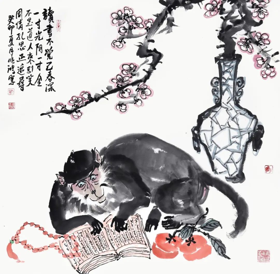 ,“献寿”画作中,五只猴子生动活泼,围绕着三只桃子,配上题字“献寿”则赋予了整个画面更深层次的意义。五只猴子象征着长寿、繁荣和吉祥。猴子的形象在传统文化中常常与长寿相提并论,而桃子则寓意着长寿。这幅画的构图巧妙地融合了动态与静态。尽管猴子们在争夺桃子,但整个画面却显得和谐宁静。这种动态与静态的对比使得画面更加生动有趣,同时也传达出一种对和谐美好生活的向往。“身心康泰天年顺,仙寿翩翩九九嘉。”岁月匆匆,转眼间又是一年。愿您在新的一年里,身体健康如常青树,精神矍铄似不老仙。笑口常开,福寿双全。 画面中的一只猴子,手捧书籍,凝神专注,表示对知识的渴望与追求。旁边的花瓶插着一枝梅花,让人联想到“梅花香自苦寒来”整个画面和谐统一,富有深意,让人感受到时间在静谧的阅读中流转,春光在不觉间已深。“宝剑锋从磨砺出,梅花香自苦寒来。”读书,可以使一个人得到精神上的充实与愉悦,并孜孜不倦地去追求。是读书,帮你埋下成功的种子;是读书,助你孕育成功的果实。画猴大师刘兆鸿先生创作的这一系列画作,笔墨沉着而不失灵动,作品充满着深远的艺术韵味。刘先生笔下的猴子栩栩如生,细节入微,情态生动。观赏他的作品,仿佛置身自然之中,感受到自然的气息,同时也能领略到传统与时代的巧妙结合。