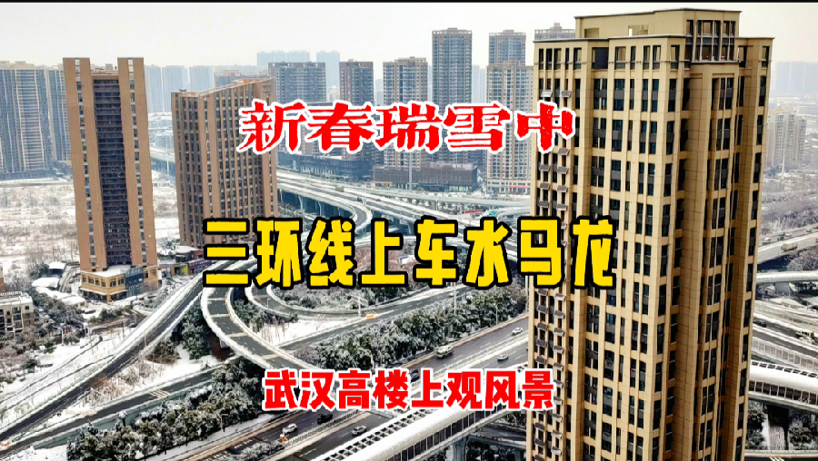 新春瑞雪中 武汉三环线上车水马龙 高楼上观景 心旷神怡