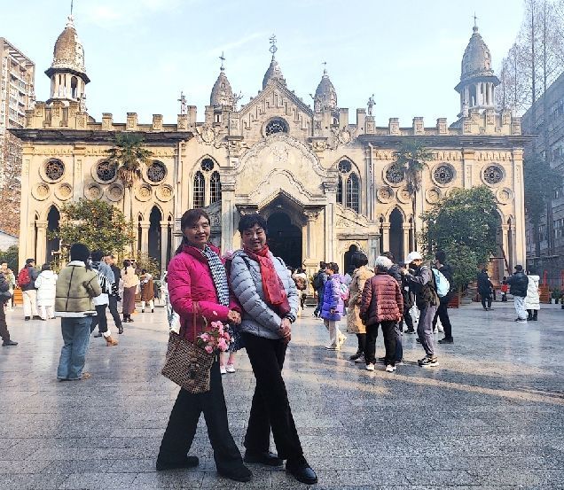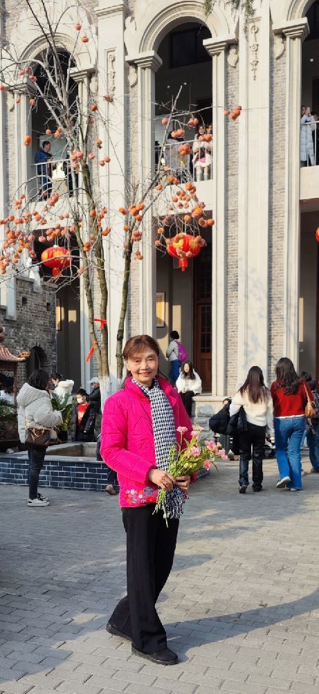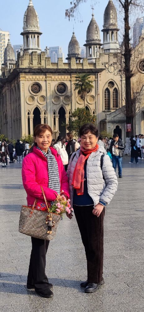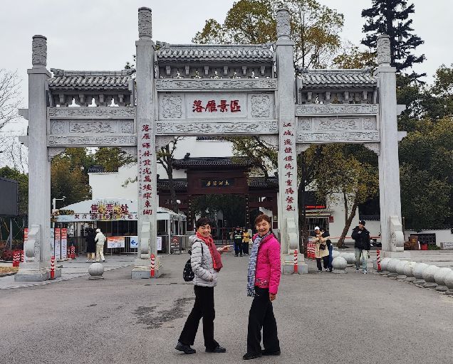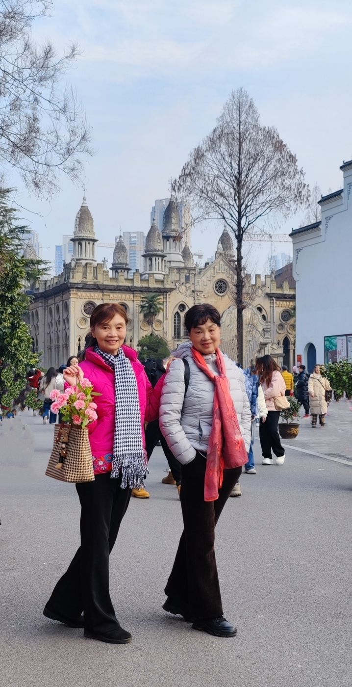 巍峨辉煌的古寺沐浴在冬日的暖阳中,别有一番异国风情!我们仿佛置身于典雅的异域庭院中,提包里的几朵小花给这别样风光又增添了几分缤纷的色彩,我们姐妹心悦神怡,在金殿前留下欢快的笑影。