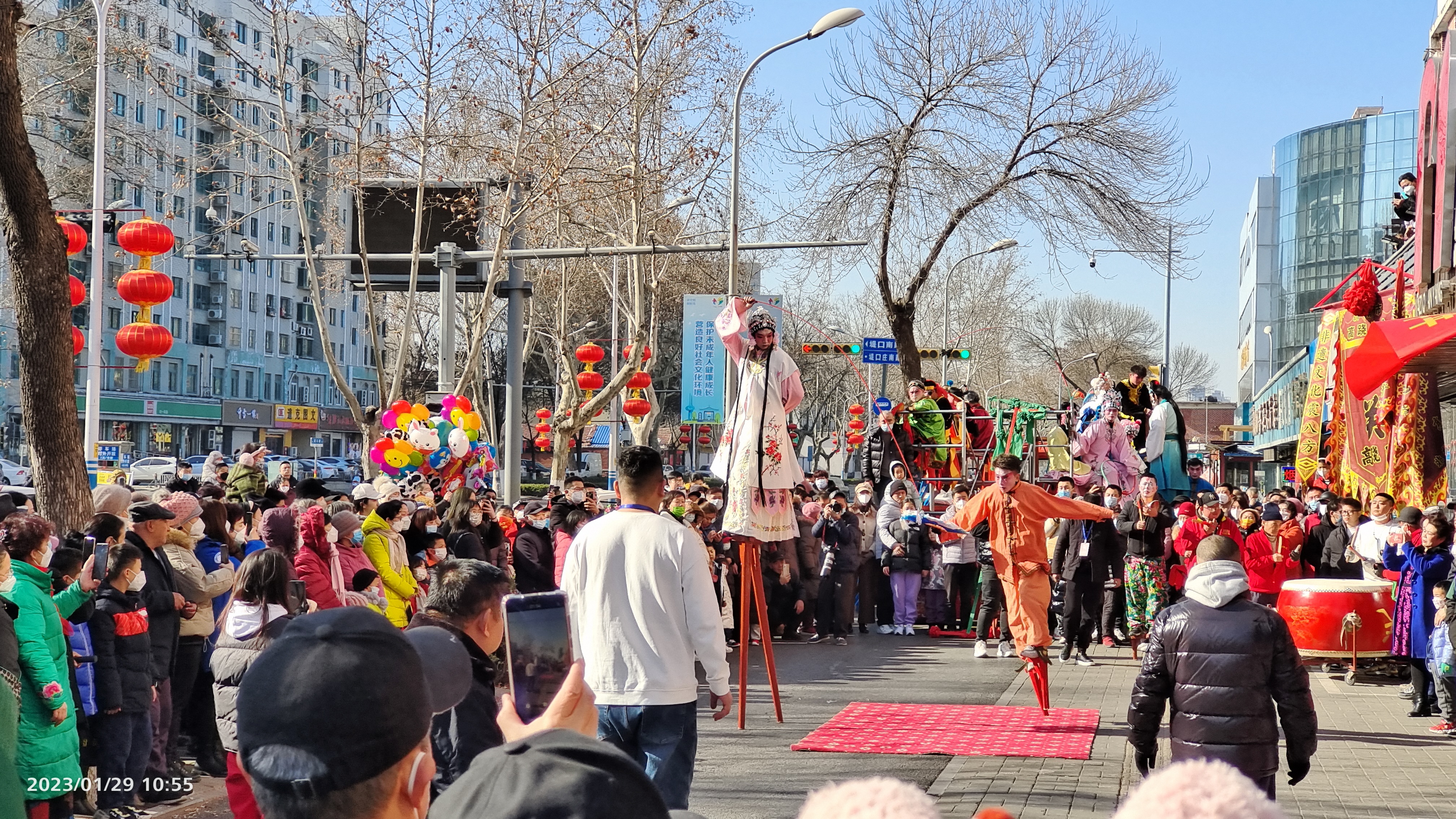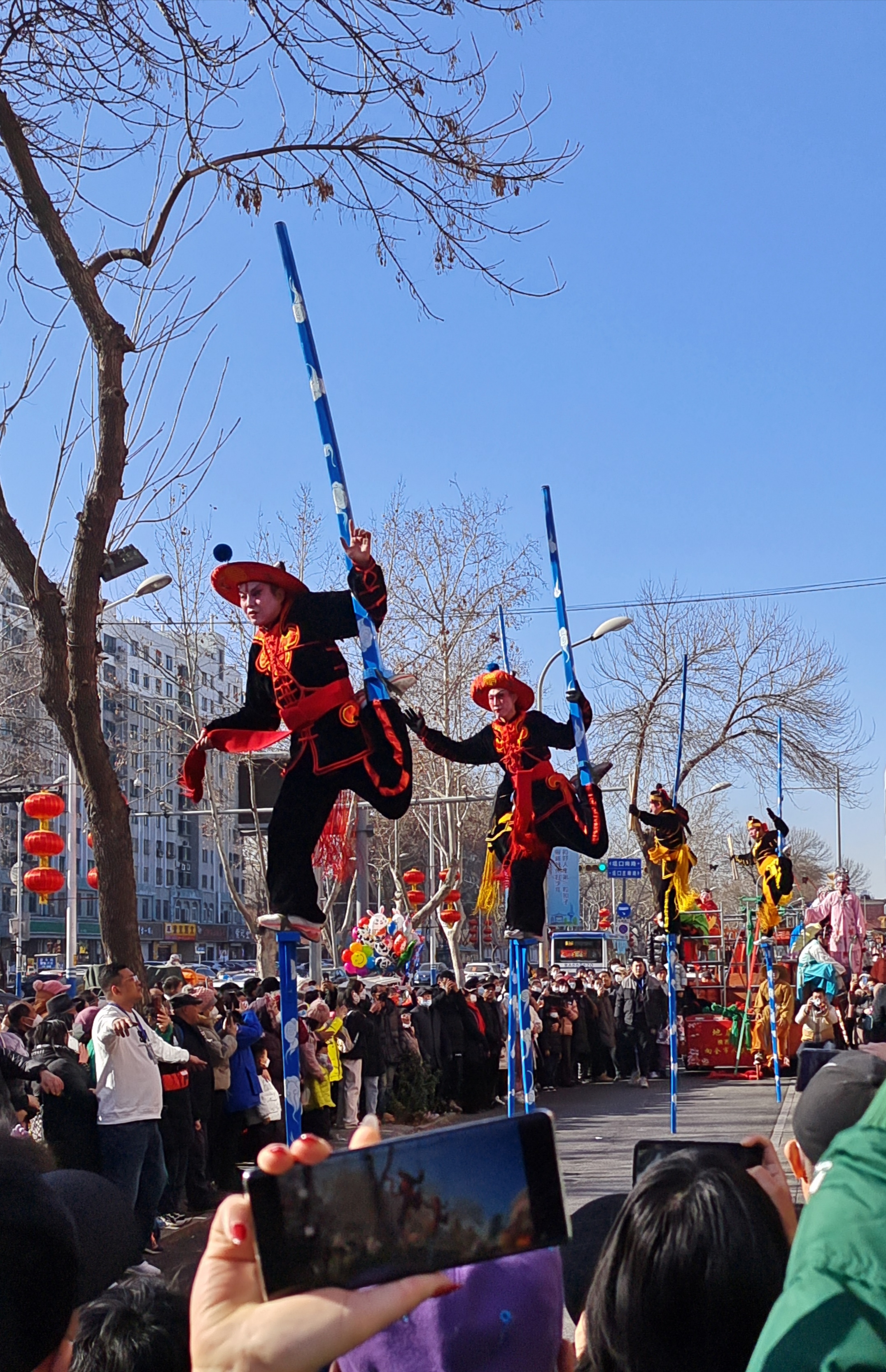 龙腾狮舞踩高跷,旱船扮玩尽快活。