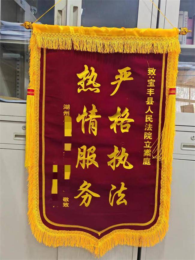 近日,宝丰县人民法院诉讼服务中心收到一件来自浙江省湖州市某企业邮寄来的包裹,是一面印有“严格执法、热情服务”的锦旗,字里行间包含着对立案工作热情、认真负责的褒奖与感谢。