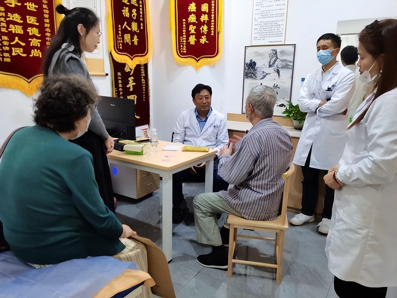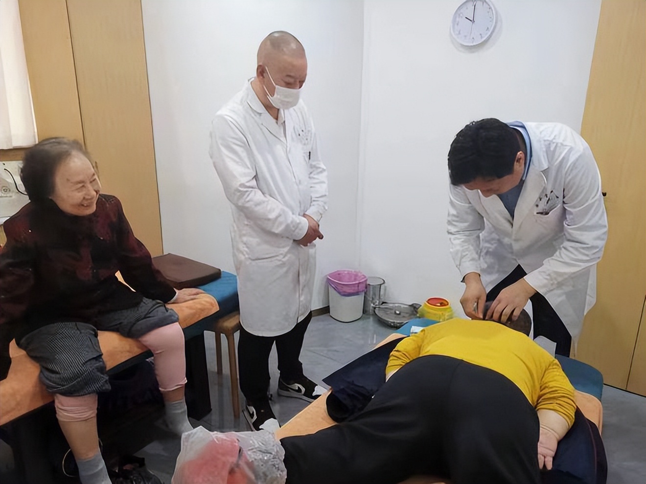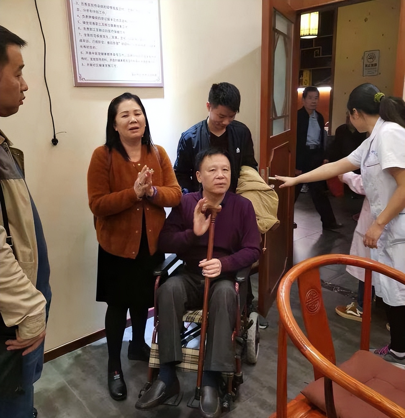 证券公司尤女士陪同校友85岁的退休老干部韩先生和太太前来就诊,尤女士是2018年12月韦国庆博士针灸奇迹见证者之一。老校友因为做过开颅手术后引起的后遗症,十几年来依靠拐杖行走,时常感到双腿无力,迈不开步子,走路缓慢,上下楼梯尤为困难,经过韦博士针灸治疗后,十几年双腿无力的症状有所改善,上下楼梯时觉得轻松多了。韩先生的太太由于腰椎间盘突出而行动不便,经过韦博士针灸治疗后当即腰疾改善明显,走路轻松了许多。