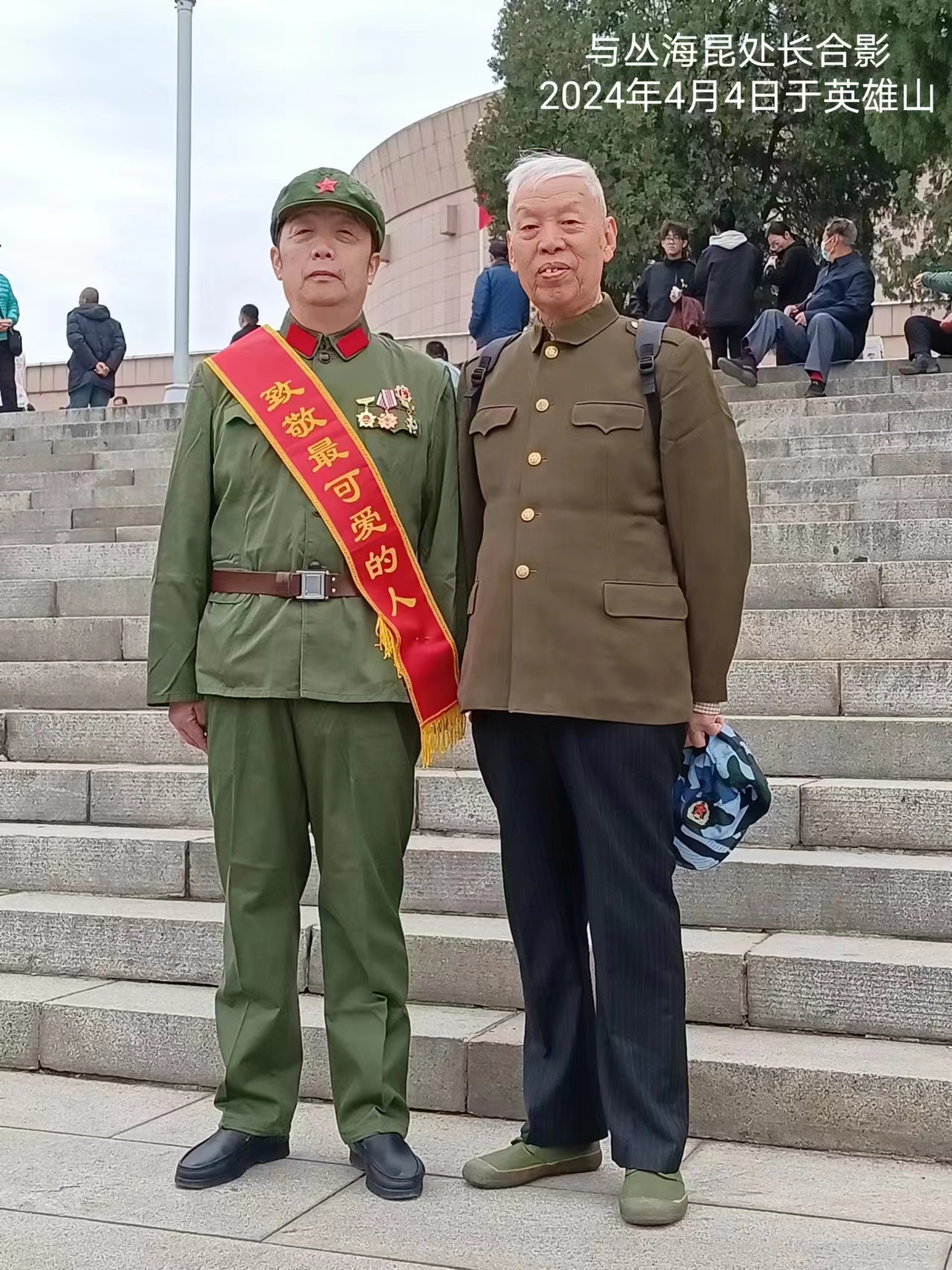 猛然间,我在老军人行列里,看到一个熟悉的身影。他是我的文友好朋友、大我十岁的老空军战士、原成都军区军务处副处长李广聚先生和他的战友们。看到已近八十岁的广聚老兄穿着军装,更显得精神矍铄,令我感到亲切。本想猛然扑上去抱住他,又想到不宜让他受到惊吓,我就正面迎上去。握手寒暄后,本意是想我俩合个影,见我们往台阶一站,就凑过几个人挤进镜头。