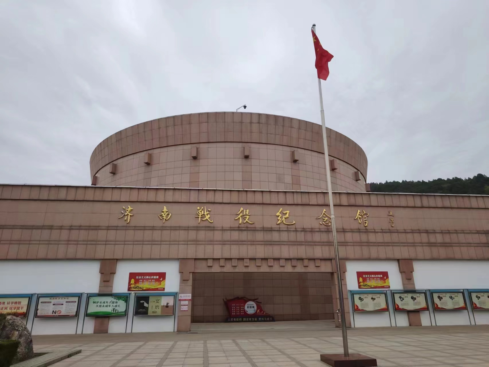 我在山顶的纪念塔下,看到有些中学生模样的孩子们,列队向济南战役纪念塔敬礼,尽管我以为是偶然现象,心里还是很感动的。待我从山的南坡走下87级台阶,再前行一百多米,看到左侧的济南战役纪念馆时,令我惊叹的一幕出现了。在飘扬着红旗的旗杆下的台阶上,数以百计千计的少年红领巾、中学生们、无计其数的青年人,正簇拥着穿上军装的老军人们,有序地排队合影留念、宣誓牢记先烈、报效祖国。意外看到这个令人激动的场面,看到一波又一波孩子们站在国旗下举起右手宣誓,我认为这就是国家的希望。
