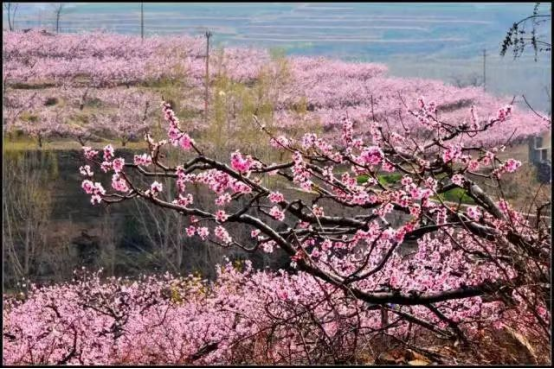 我们忘记了风尘仆仆的劳顿,也忽略了盘旋山路的惊险,一路向上,迎着桃花,逐光而行。每登一层梯田,每拐一个弯,所见景致又有不同。每处的桃花海如霞似锦,即使在土丘怪石之间,也藏着桃花点缀其中,大大增添了田野山谷清新灵气。桃树镶嵌在梯田的沟沟岭岭间,大小不一,形状各异,高低错落,颜色不同,凹凹凸凸,弯弯曲曲,枝枝相连,浑然一体的绝美画卷展现在眼前。