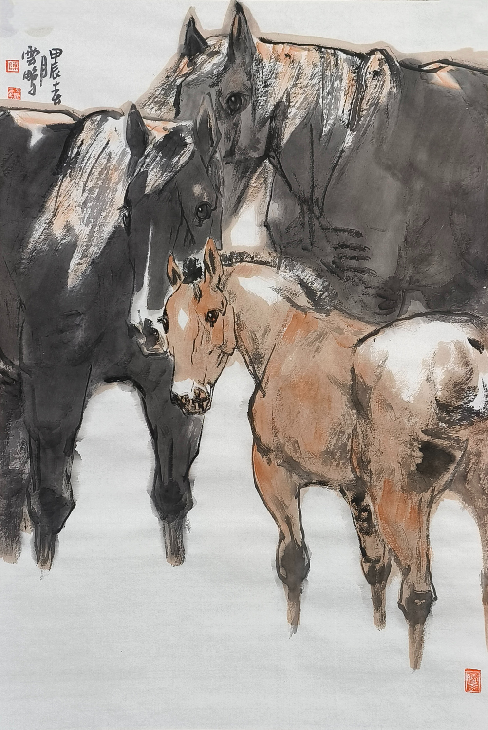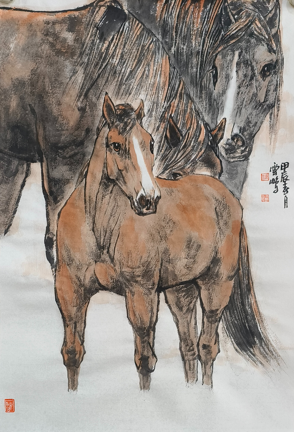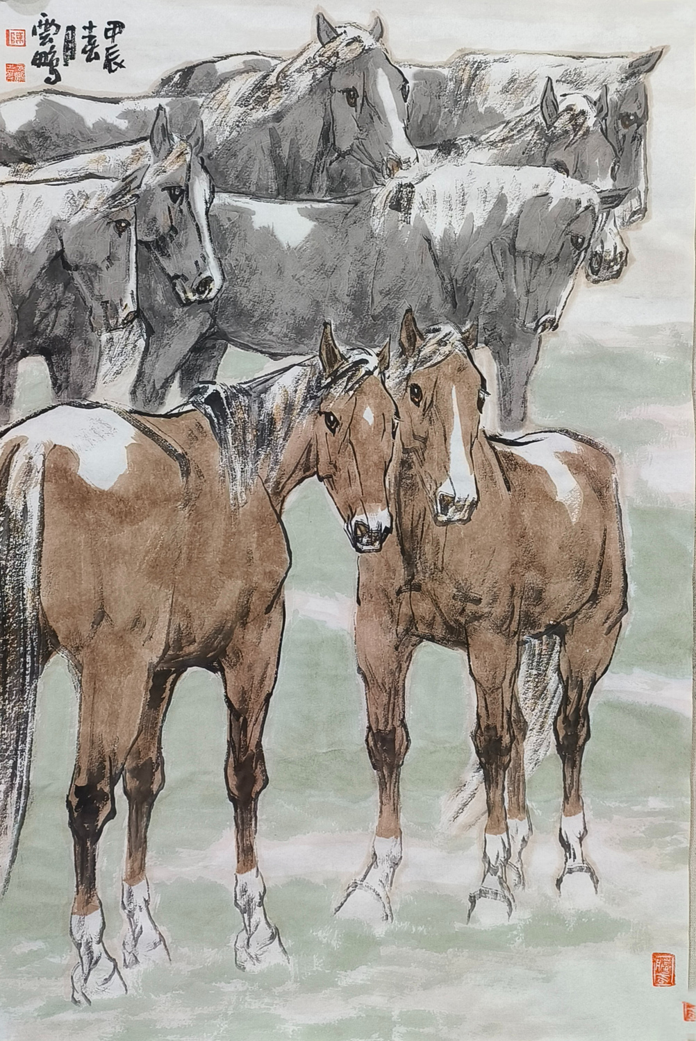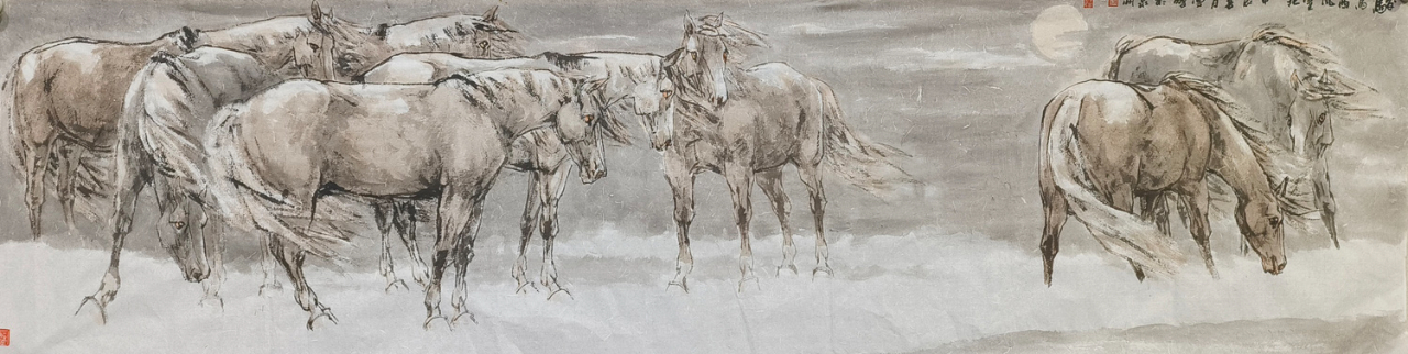 观陈先生的画作,他笔下的马,或奔腾于草原,或静立于林间,或昂首嘶鸣,或低头沉思,无不栩栩如生,跃然纸上。那线条的流畅与匀细,如同山涧清泉,婉转而又坚定;那色调的蓬勃与古雅,如同晚霞映照下的古城,温暖而又庄重。他巧妙地运用虚实相生的手法,将马的神态与情感展现得淋漓尽致,让人仿佛能够听到马的嘶鸣,感受到马的奔腾。