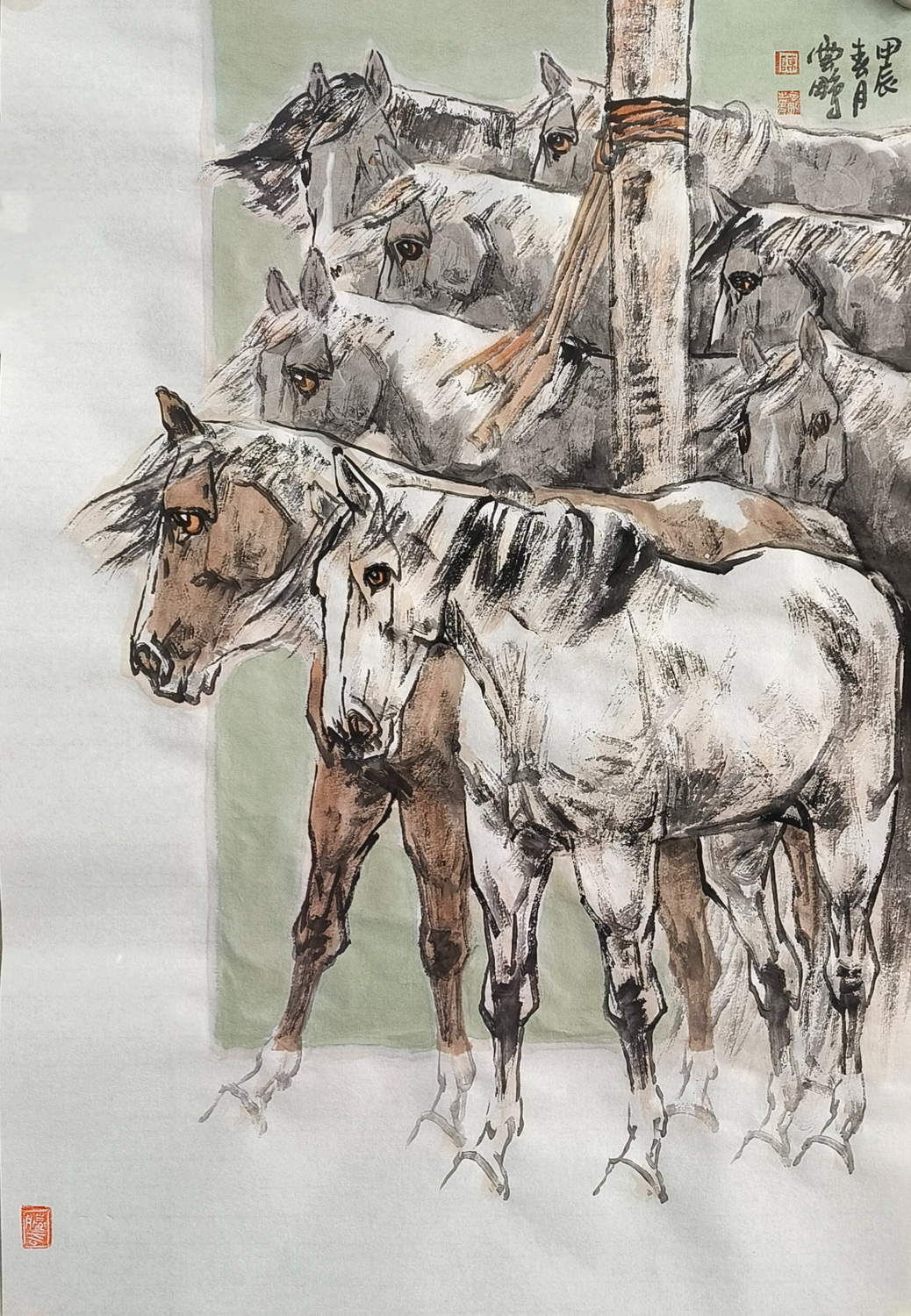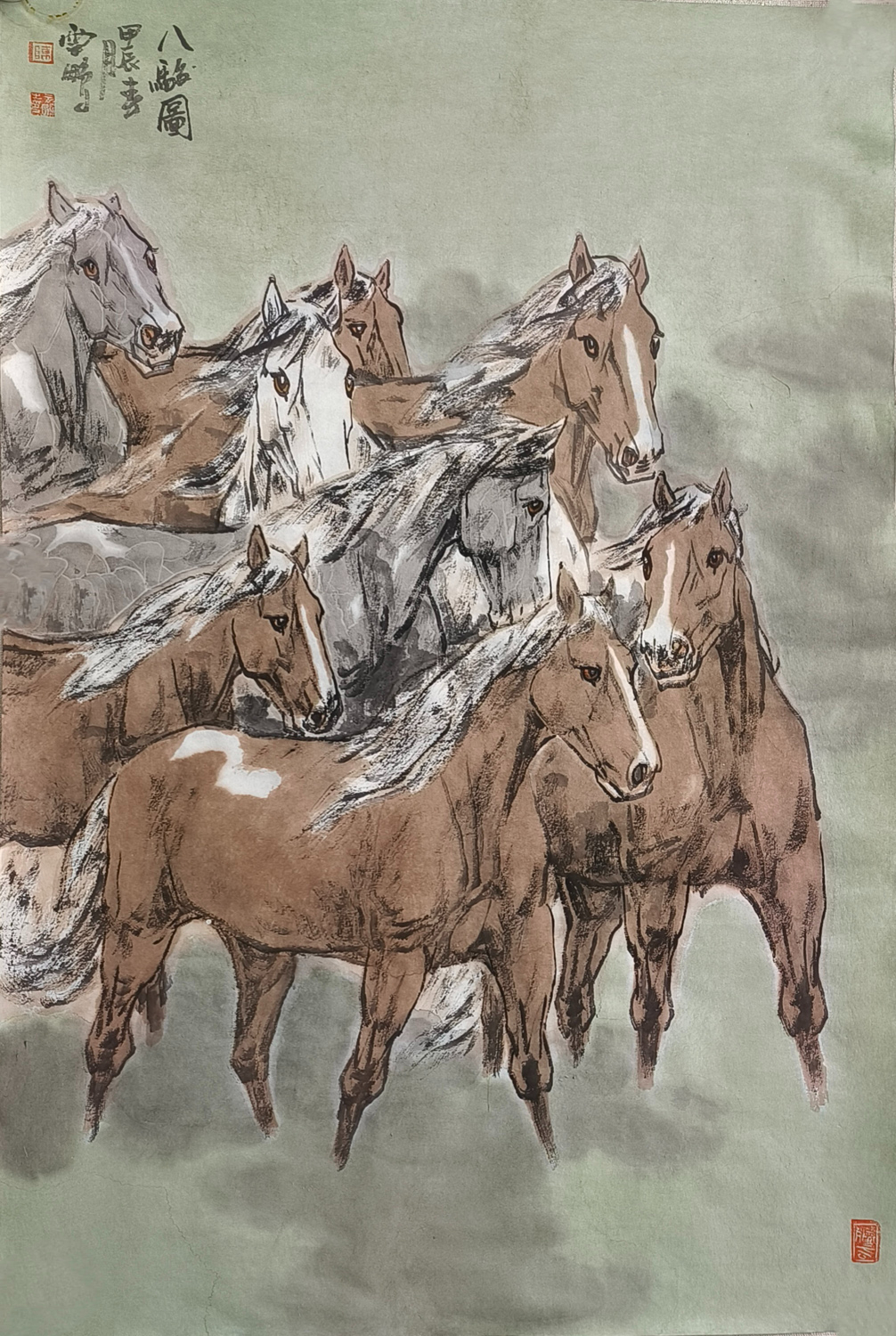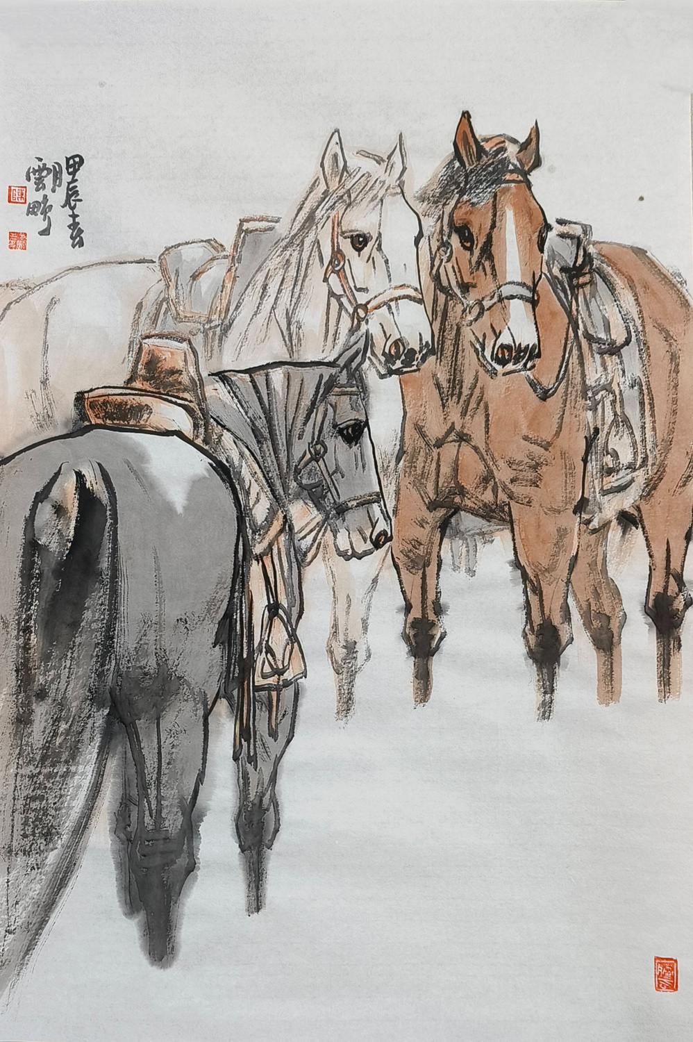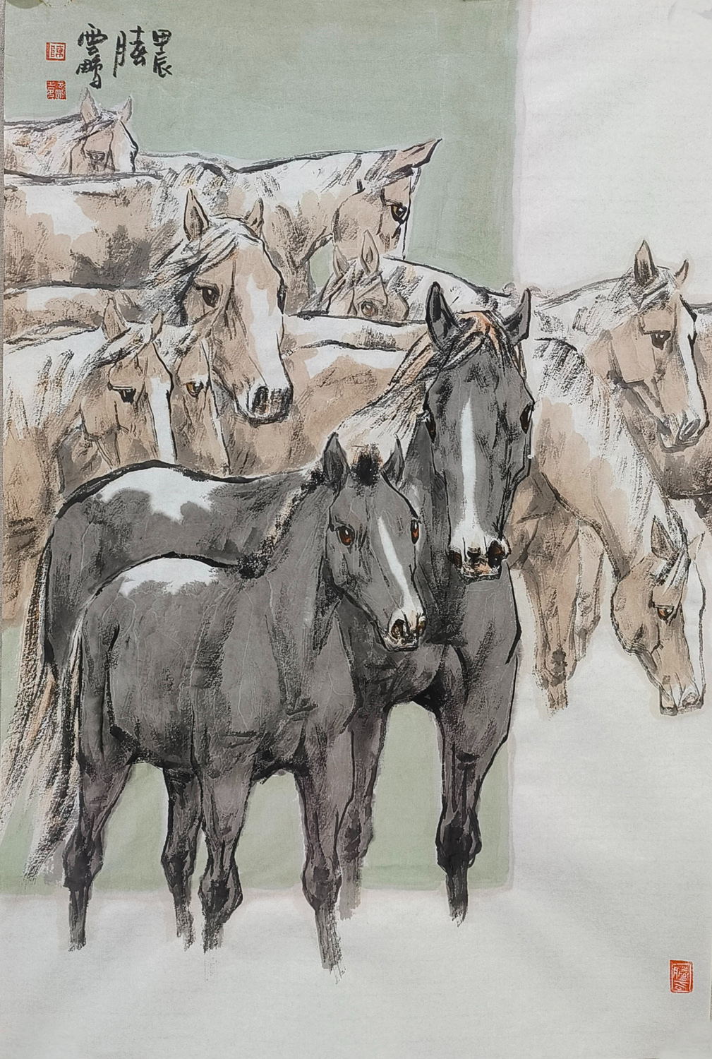 观陈先生的画作,他笔下的马,或奔腾于草原,或静立于林间,或昂首嘶鸣,或低头沉思,无不栩栩如生,跃然纸上。那线条的流畅与匀细,如同山涧清泉,婉转而又坚定;那色调的蓬勃与古雅,如同晚霞映照下的古城,温暖而又庄重。他巧妙地运用虚实相生的手法,将马的神态与情感展现得淋漓尽致,让人仿佛能够听到马的嘶鸣,感受到马的奔腾。