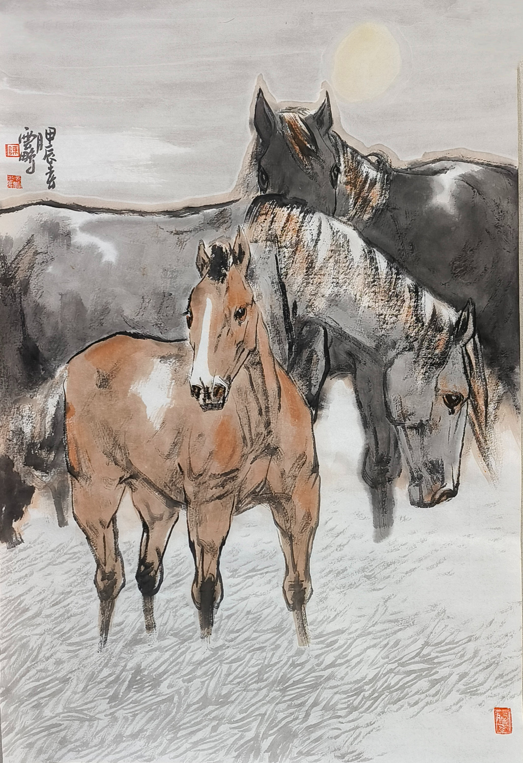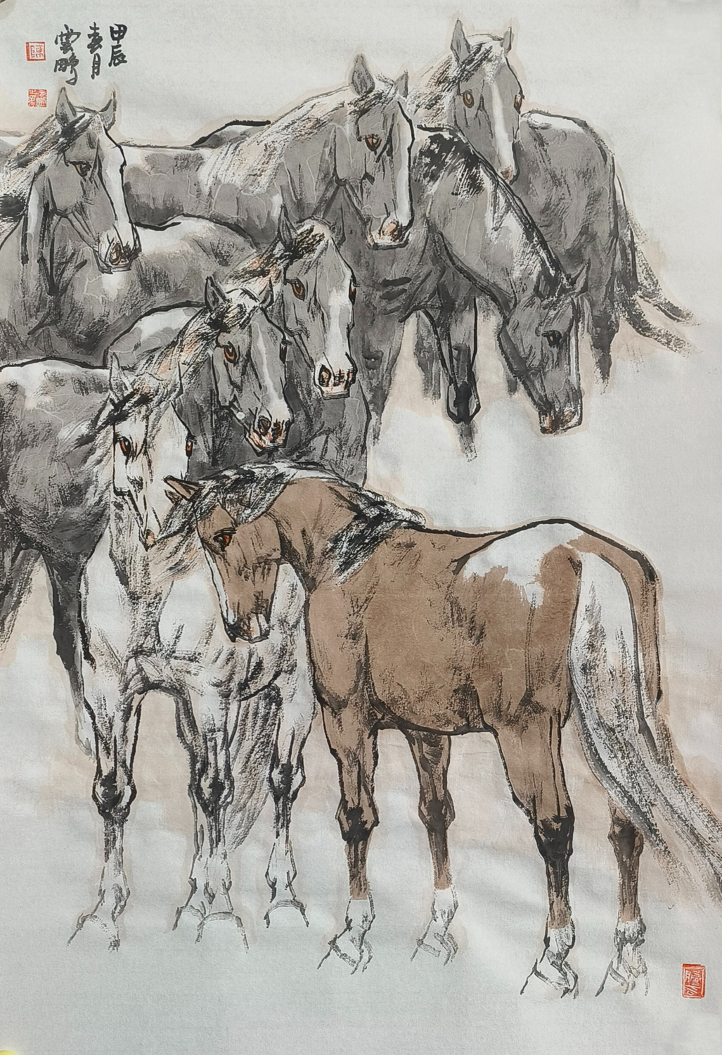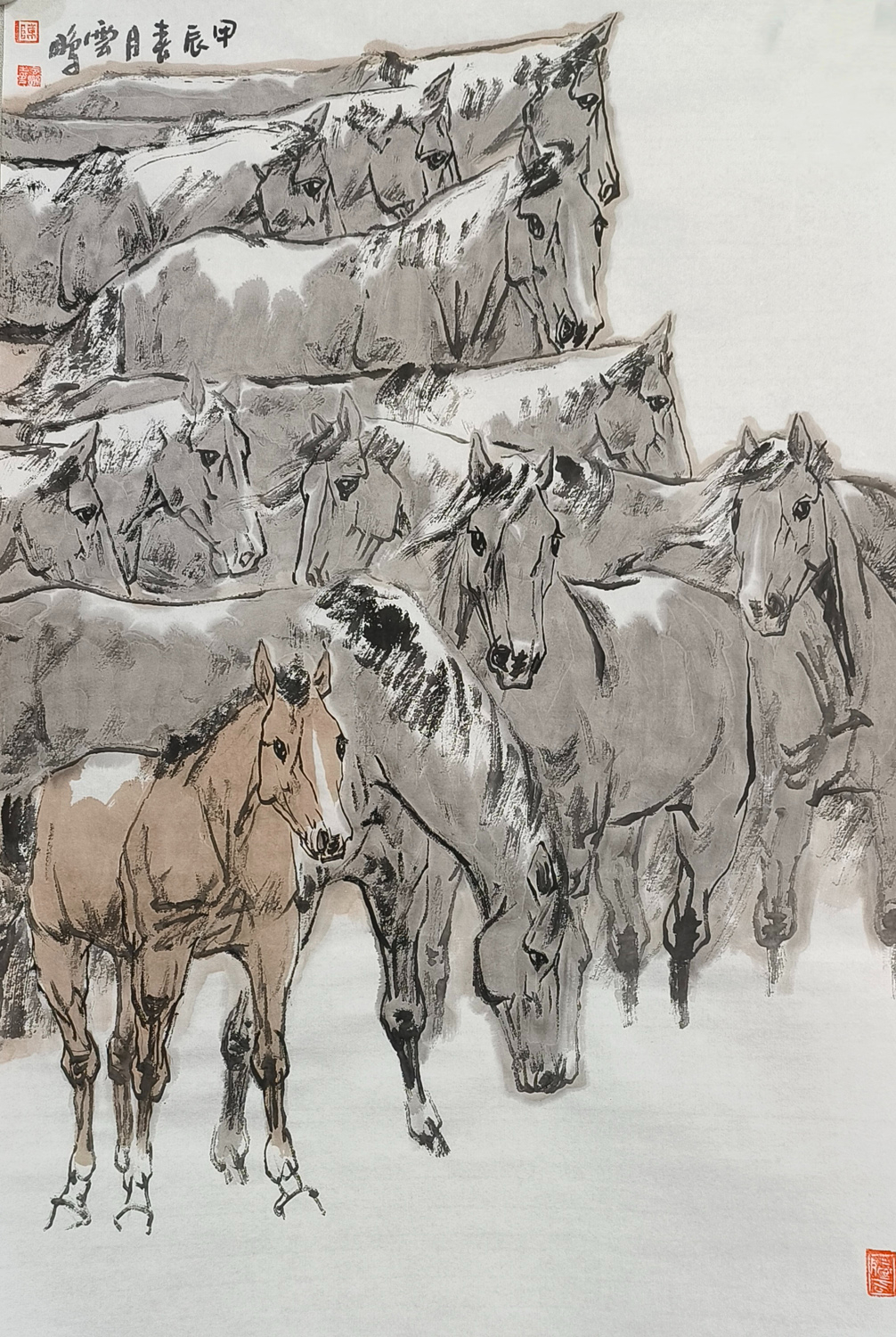 陈云鹏先生笔下的马,犹如诗中的精灵,跃然纸上,灵动而深邃。他绘马的技艺,如同流水潺潺,又如风过竹林,流畅而又不失细腻,既有古朴的韵味,又充满现代的艺术气息。