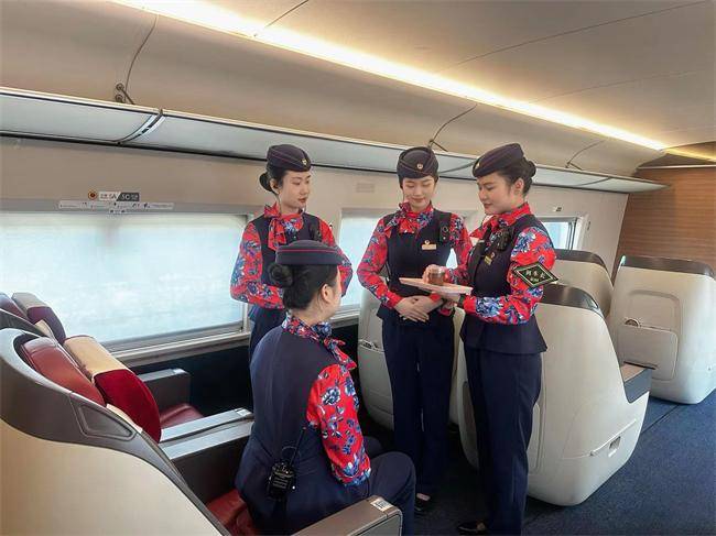 高铁一队京西四组乘务班组利用折返休息时间培训班组服务礼仪,进行情景演示。班组以高标准,着力客运提质,打造黄金线路。