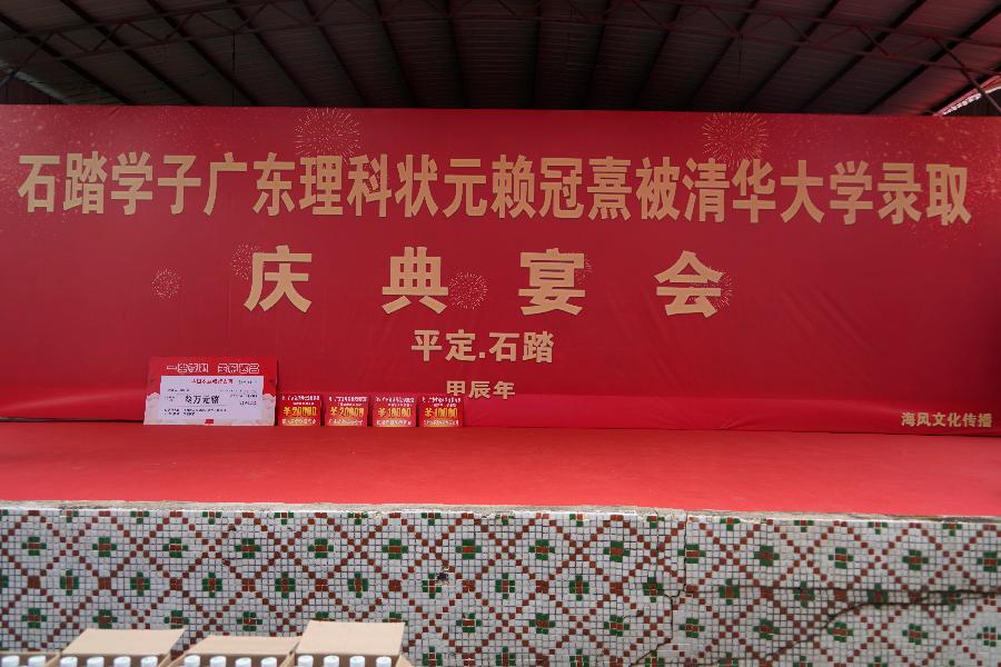 2024年8月9日(农历甲辰七月初六)14.00至16.00时,2024年高考广东省物理类状元赖冠熹父母双亲暨石踏村赖氏宗亲在化州市平定镇翰堂村委会石踏村举行“感恩升学宴会”,出席宴会的老师、乡贤、宗亲、嘉宾有:化州市区培养赖冠熹学子成长的相关小学、中学的老师、平定镇中、小学校、商会、乡贤、宗亲会相关负责人、老师及各地赖氏宗亲代表、社会各界友好人士共500多人,有关负责人在宴会上致辞祝贺和状元赖冠熹及父亲赖泽明,分别在会上作了发言,部分企业界代表分别给状元颁发了奖学金。宴会充满着重文、重教、重才、热情、祥和、喜庆、隆重的气氛。作者特赋诗一首,祝贺宴会取得圆满成功,诗文如下:
