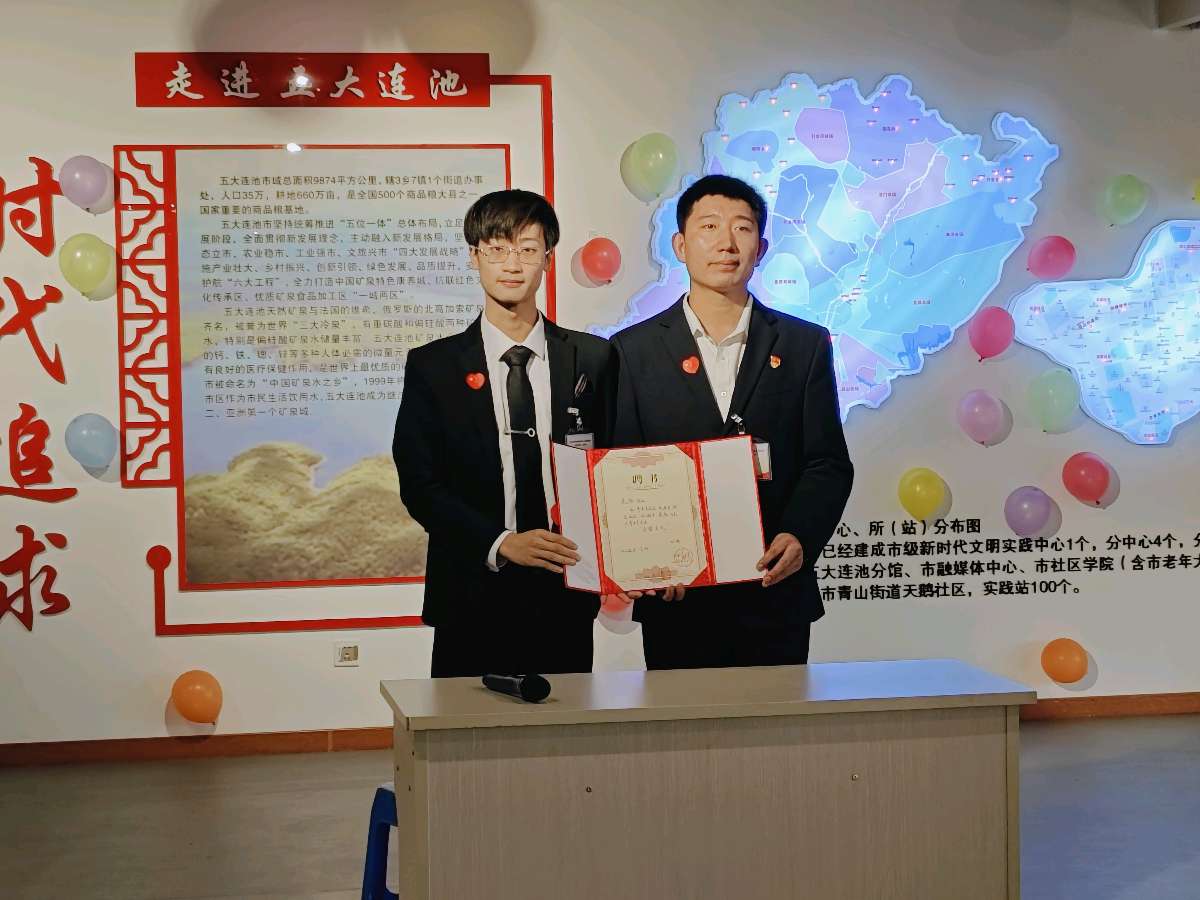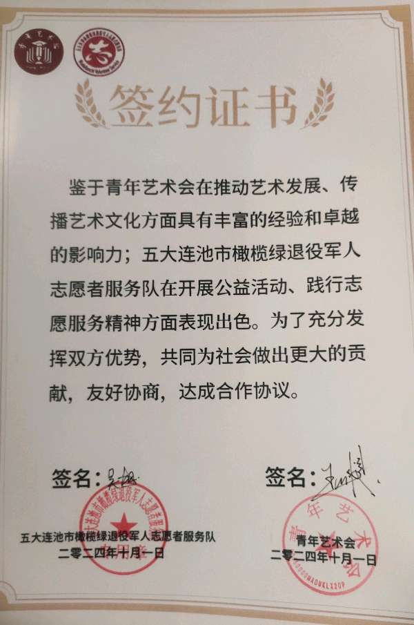 青年艺术会会长王明昊聘请五大连池市橄榄绿退役军人志愿者服务队发起人吴旭,为青年艺术会名誉会长。吴旭聘请刘宏波同志为五大连池市橄榄绿退役军人志愿者服务队秘书长。青年艺术会会长王明昊和五大连池市橄榄绿退役军人志愿者服务队发起人吴旭,签约合作